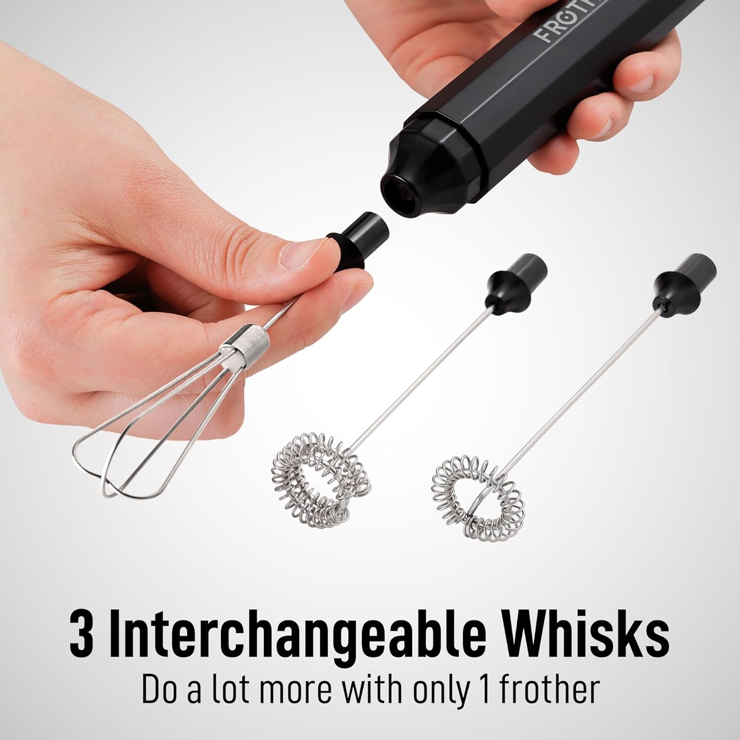 - 3-in-1 Whisk Set + Travel Case: Includes single whisk, double whisk, and egg beater attachments for frothing, whipping, and mixing. Comes with a durable travel case to store all parts organized on the go.