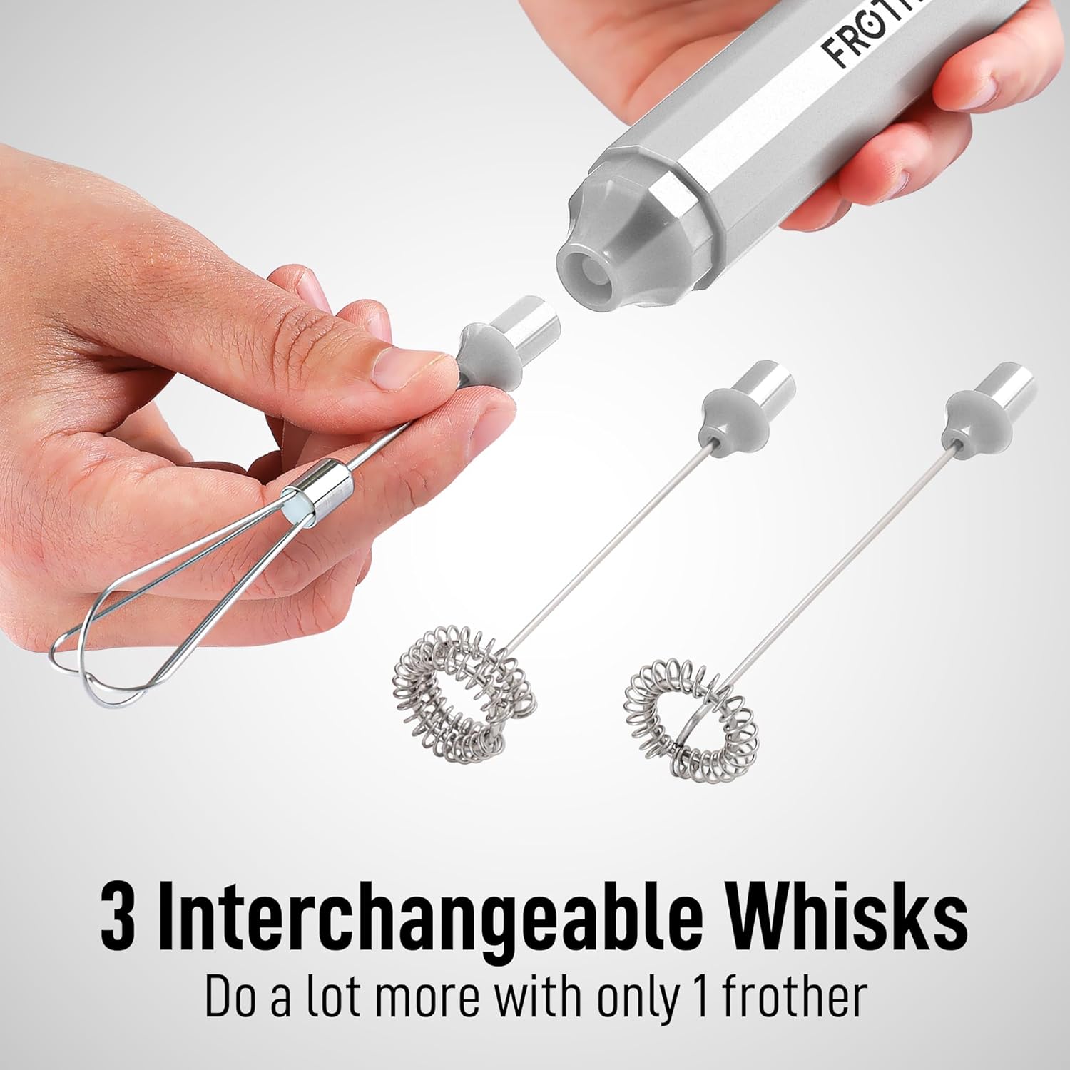 - 3-in-1 Whisk Set + Travel Case: Includes single whisk, double whisk, and egg beater attachments for frothing, whipping, and mixing. Comes with a durable travel case to store all parts organized on the go.