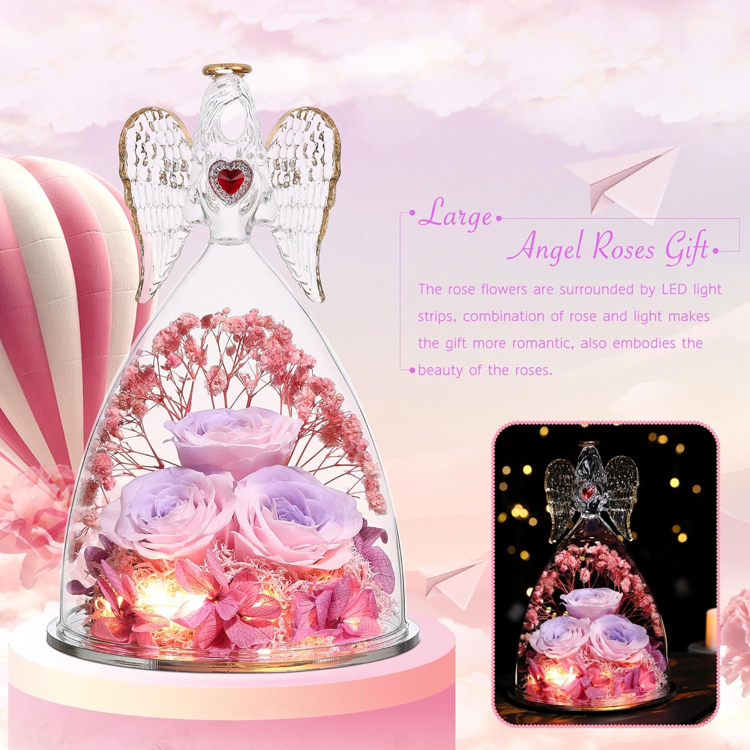 Mothers Day Rose Gifts for Women, Large Angel Figurines with Real Roses, Preserved Real Flower Rose for Her, PinkPurPink