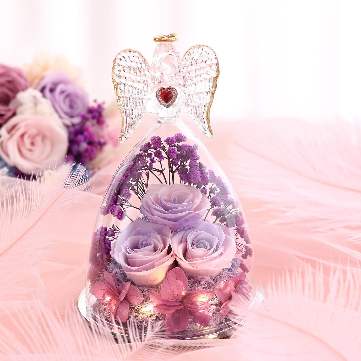Mothers Day Rose Gifts for Women, Large Angel Figurines with Real Roses, Preserved Real Flower Rose for Her, PinkPurPur