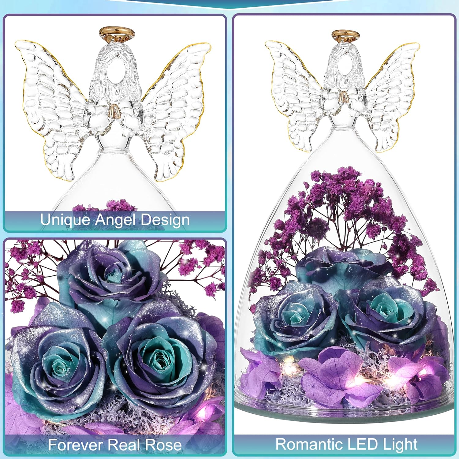 Christmas Rose Gifts for Women Preserved Real Flower in Glass Angel Figurines Roses for Delivery Prime Birthday Gifts for Mom Grandma Girlfriend Wife Her, GlitterBluePurple