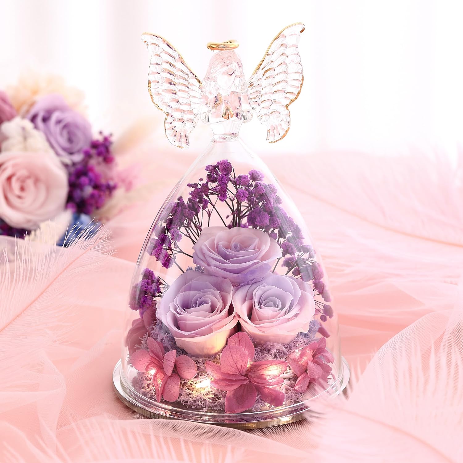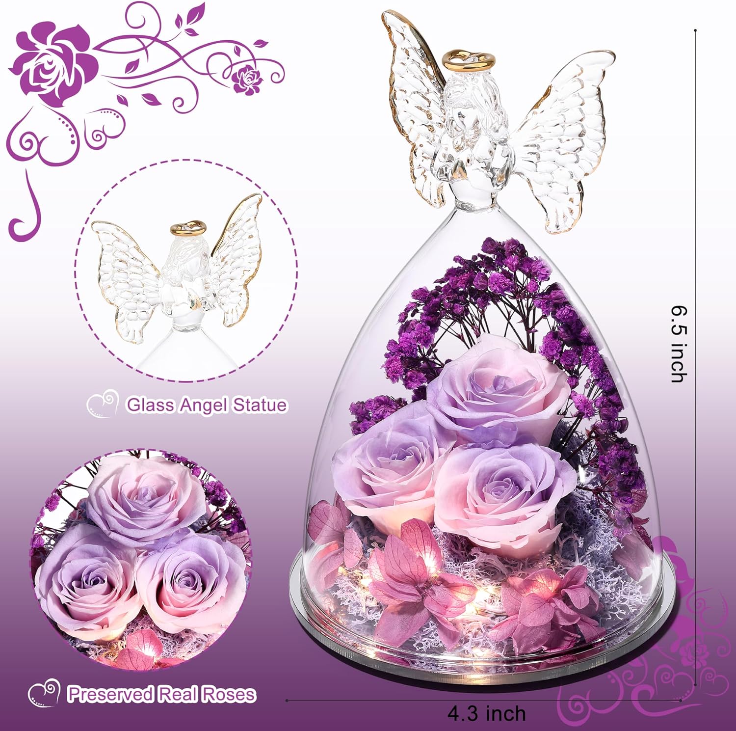 Christmas Rose Gifts for Women Preserved Real Flower in Glass Angel Figurines Roses for Delivery Prime Birthday Gifts for Mom Grandma Girlfriend Wife Her, Pinkpurpurple