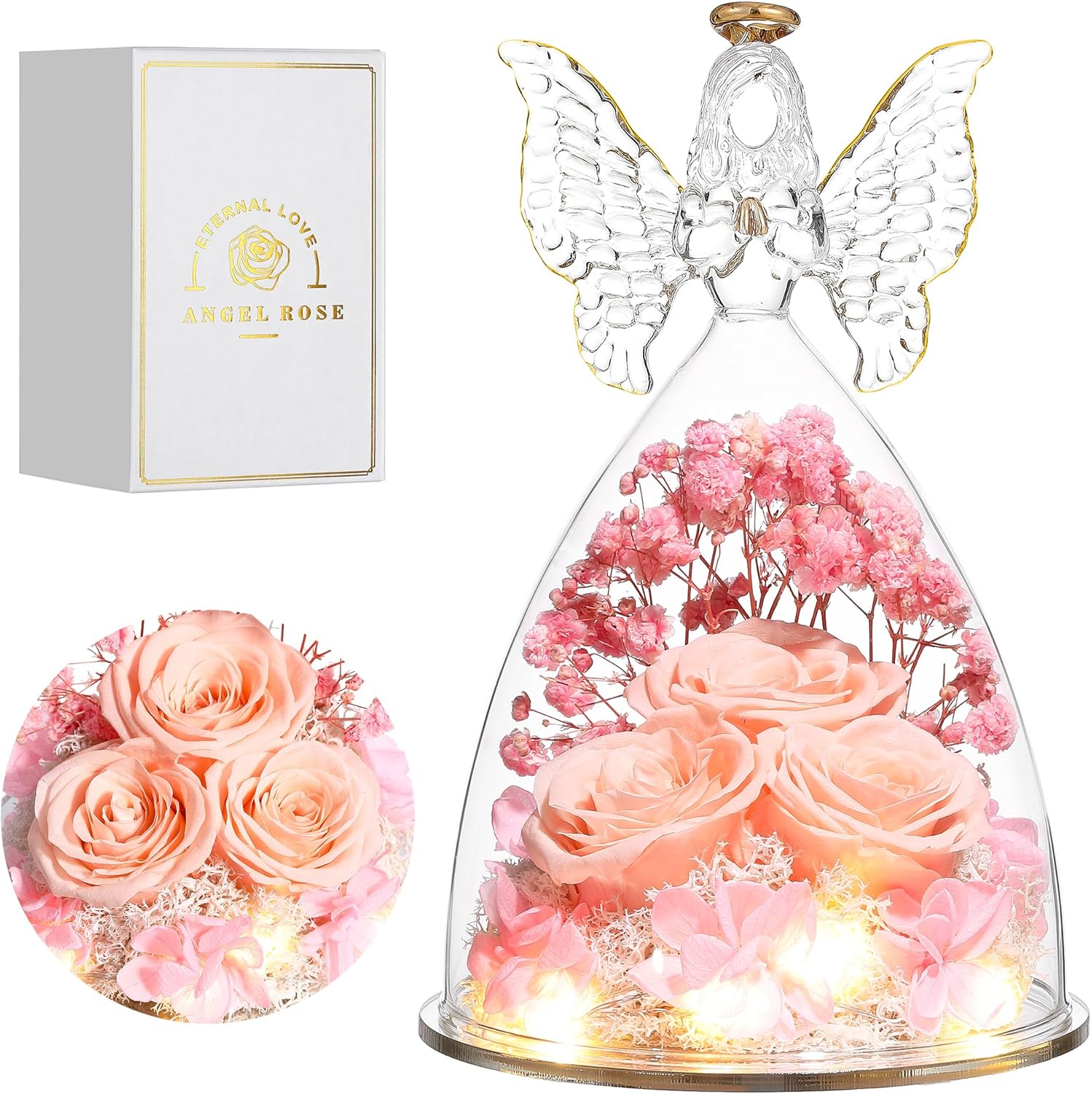 Christmas Rose Gifts for Women Preserved Real Flower in Glass Angel Figurines Roses for Delivery Prime Birthday Gifts for Mom Grandma Girlfriend Wife Her, Champagne