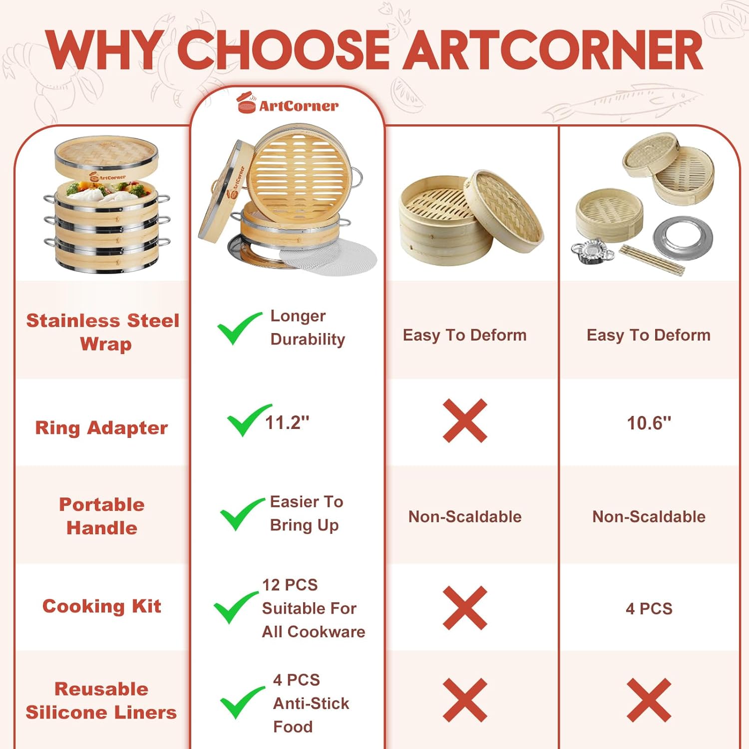 - Natural Bamboo Material:Steam your favorite foods with our premium bamboo steamer, crafted from 100% natural bamboo.Ideal for steamingdumplings,asparagus,seafood and more.Designed to retain the authentic flavors and nutrients of your food.
