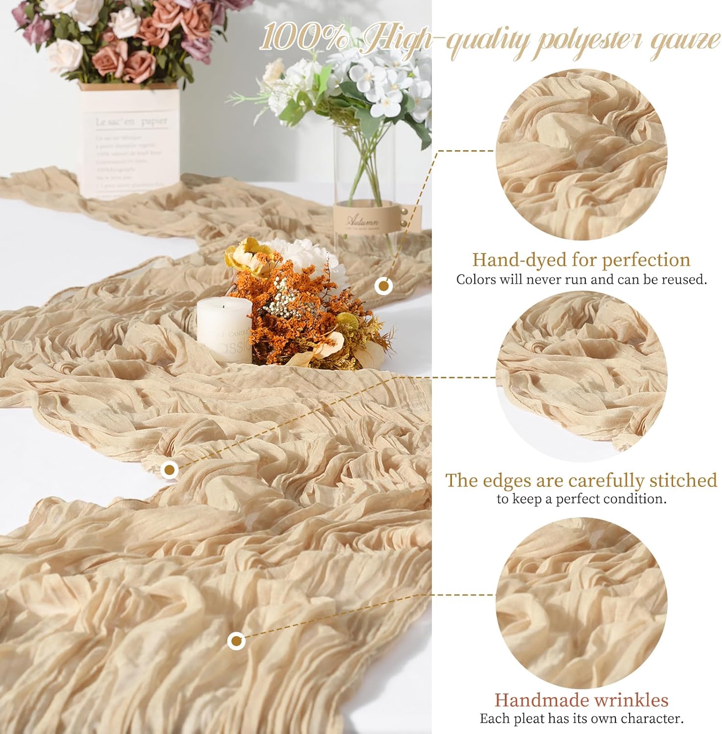 - 【Easy Wash & Care】- Machine wash in a laundry bag or Hand wash in cold water with mild detergent.No ironing is required to maintain a wrinkled texture.Dry cleaning is not recommended, the air drys naturally.The high quality ensures that our cheesecloth wedding table runners are Reliable, the colour stays for a long time, does not fade and can be reused.