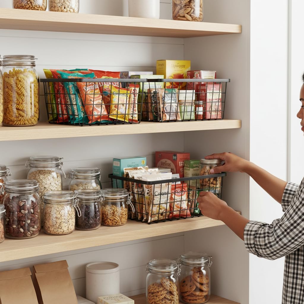 Kitchen Metal Wire Baskets with Handles Food Storage Organizer, Household Refrigerator for Cabinets,Pantry,Bathroom,Black,4 Pack