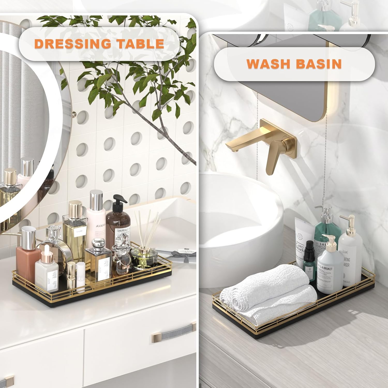 - Considerate Design: This bathroom trays for counter is ready to use without any installation required; Upgraded embedded welding design enhances stability and aesthetics; Raised edge prevent items from slipping; 4 non-slip pads on the bottom protect surfaces from scratches; Simplify your cleaning routine with just a quick wipe-down using a damp cloth, saving you time and hassle