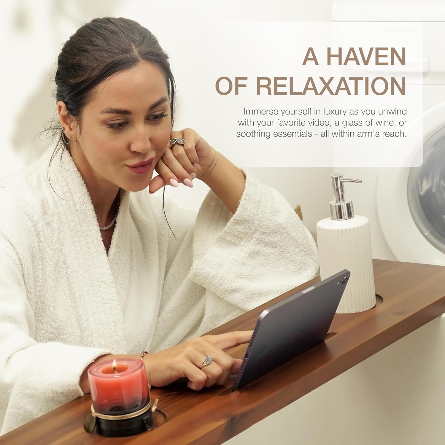 - Functional Design: Features dedicated slots for your phone and iPad, tablets along with two grooves to securely hold wine glasses or your favorite beverages, adding a touch of luxury to your bathing ritual.