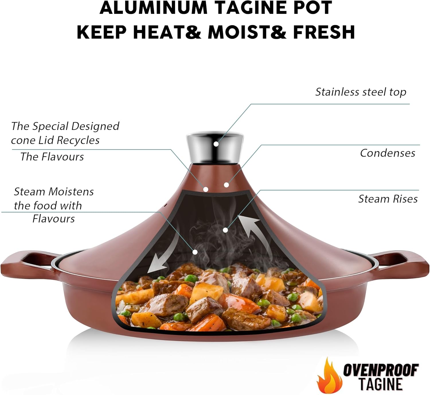 - TAGINE STYLE COOKWARE - INSETFY frying pan uses a conical lid, this design helps to concentrate the steam and heat the food evenly, reducing moisture loss. During the cooking process, just add a little water and the steam will drip evenly onto the ingredients. This design not only helps to maintain the original flavor and nutrition of the food, but also has a good heat retention effect, which keeps the food hot for a period of time.