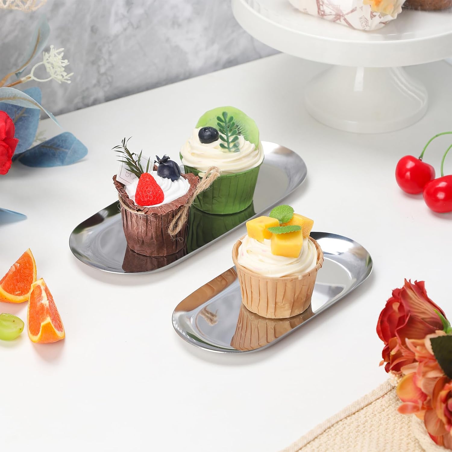 - Stainless steel serving tray – Made from high quality stainless steel. These are sturdy and durable. The stainless steel serving tray is easy to clean and wash. These trays are perfect to catch drips from soap dispenser bottles.