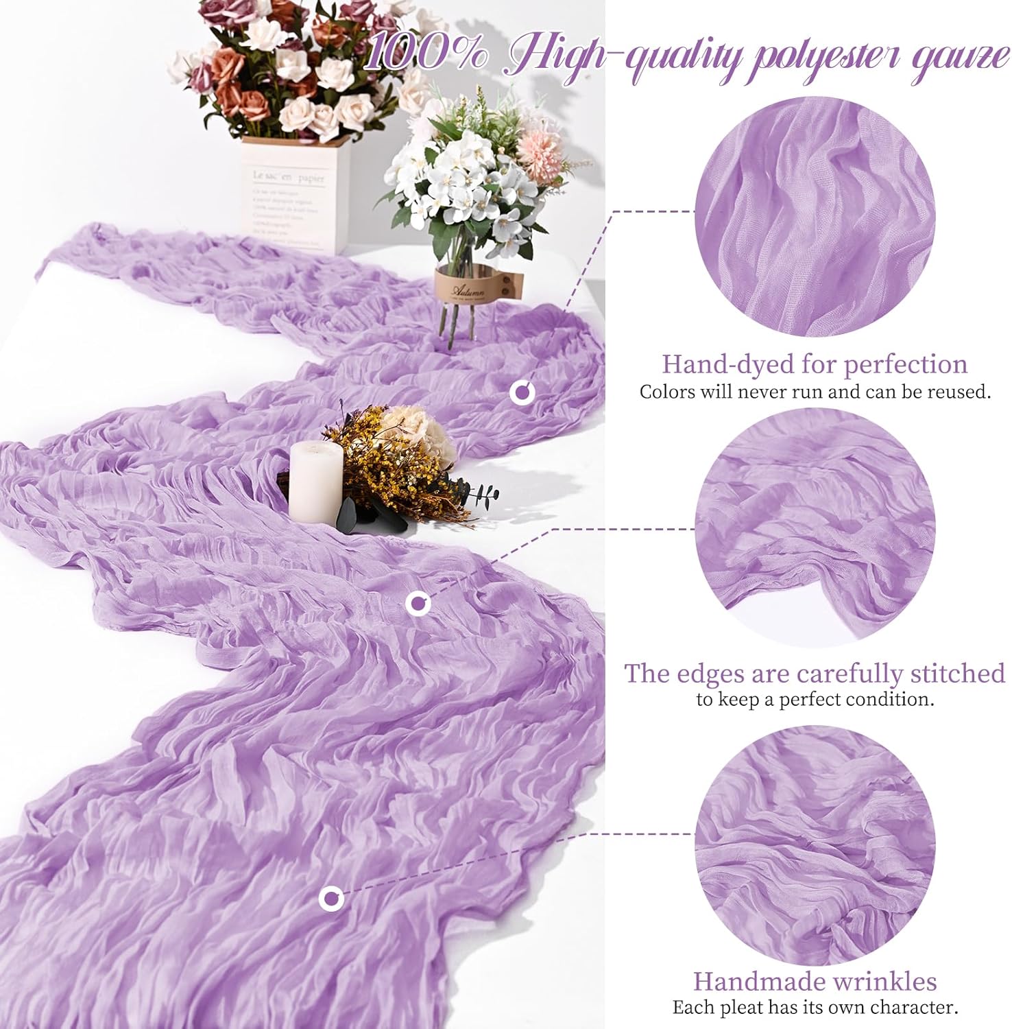 - 【15 PACKS Included, Size & Color】- You will get 15 PACKS Lilac cotton and linen gauze table runner, with wrinkled, approx.21.5" wide and 10 ft length.Our fall table runners are 120 inches long and Great for both rectangular and round tables or other shaped tables.And They are the Great decoration for wedding arches or tables, chair belts, curtains, fireplaces, cabinets, sofas, etc.