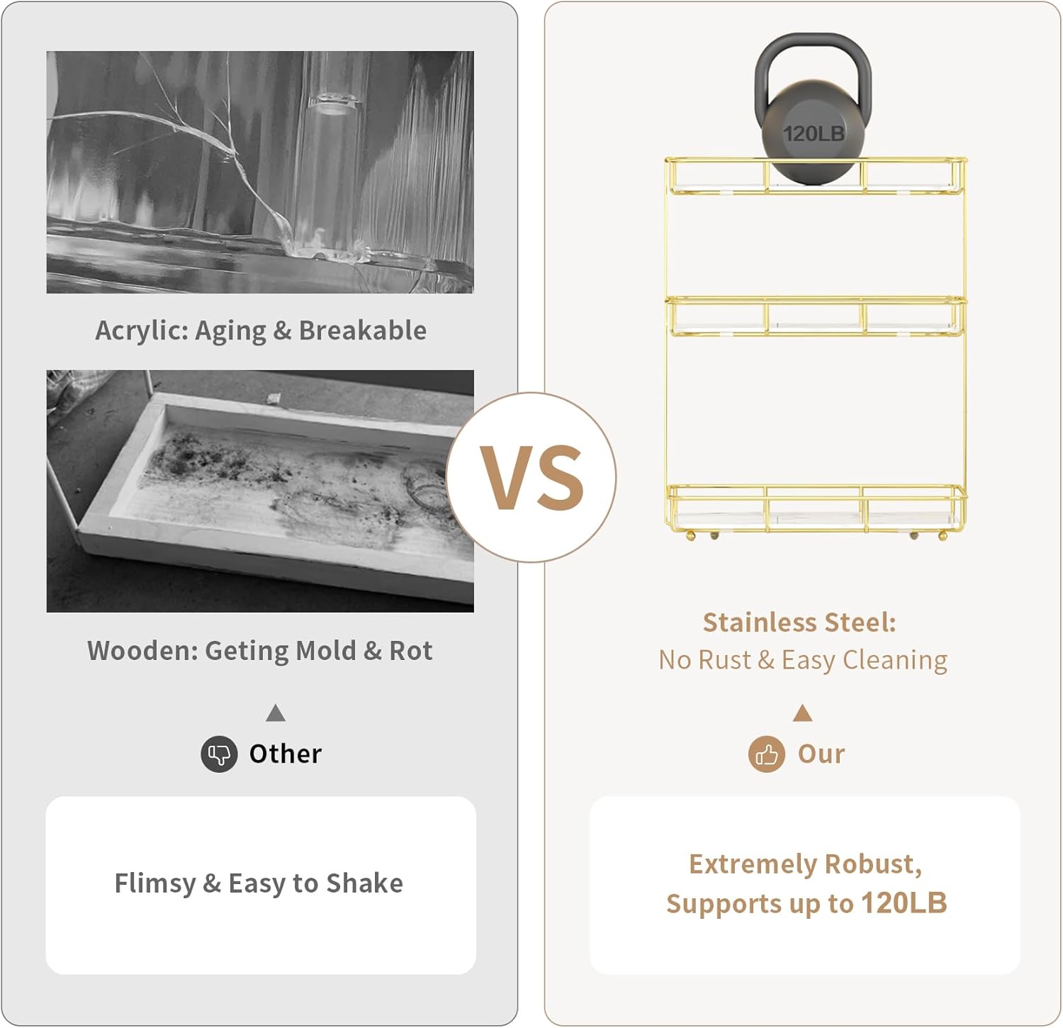 - MULTI-PURPOSE STORAGE SHELF: This countertop organizer is perfect for adding extra storage to small areas like your dresser, sink or kitchen. The modern and simple design of this vanity shelf makes it a great way to declutter and organize your home in a cinch.