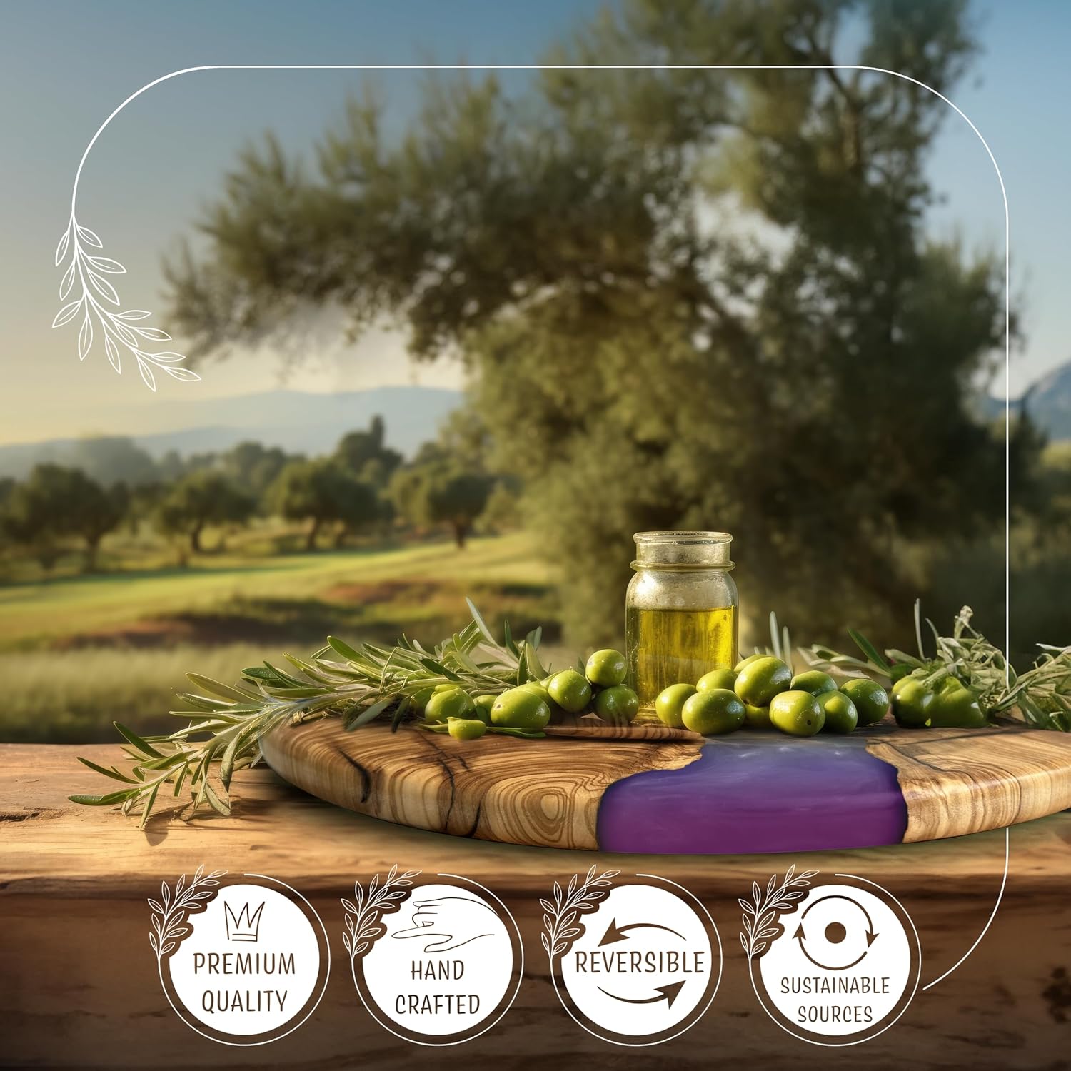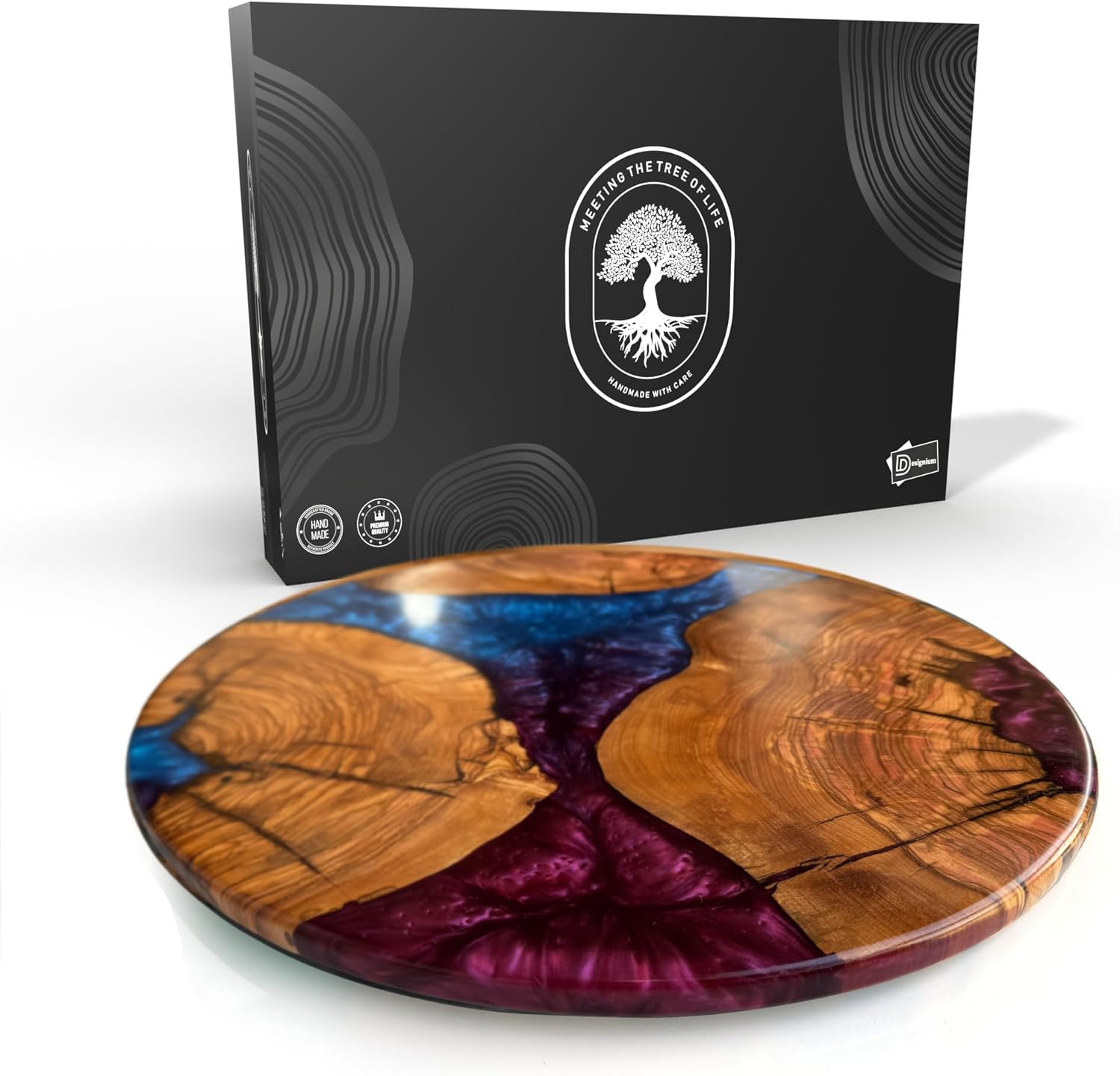 - HANDCRAFTED OLIVE WOOD CUTTING BOARD: Decorative wooden large round charcuterie board and wooden pizza serving tray has been carefully handcrafted from natural olive wood board for charcuterie. Our art resin round cutting boards for kitchen are offered in an artisan-inspired rustic shape. Handmade cutting boards wood products are easy to care for as resin round trays home decor. This circular cutting board wood resin for cheese and wine has a dense grain and can last not only for your lifetime but for generations.