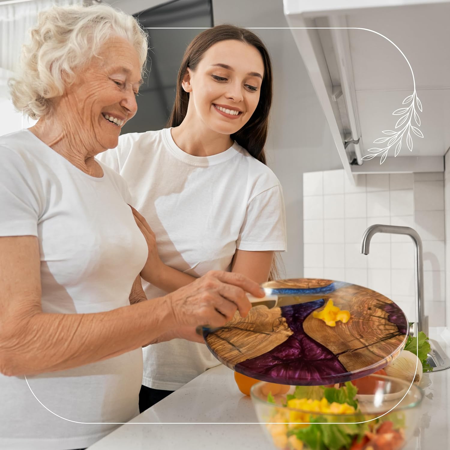 - STUNNING AND STYLISH GIFT: This solid wood cutting board mold epoxy adds a stunning touch to interior home and kitchen decoration. Round serving tray makes the most memorable house warming gifts new home. Our resin round cutting boards for charcuterie cheese boards are beautiful housewarming gift for women, wedding registry items, couples gifts, bridal shower gift, weddings, anniversaries, Christmas, Thanksgiving, birthdays and mother days gifts. This large round cutting board comes in its own exquisite well-packed black gift box.