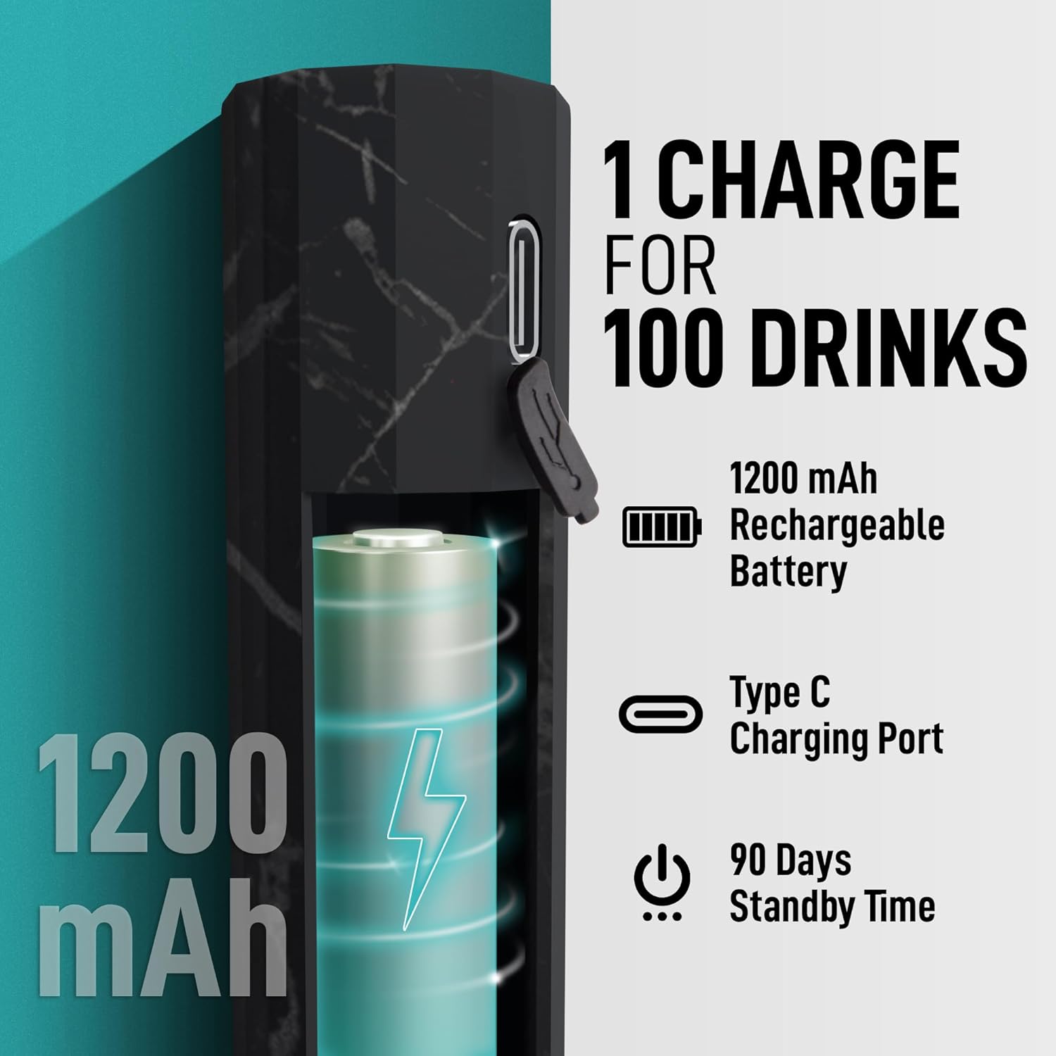 - Long-Lasting Rechargeable Battery: 1200 mAh lithium battery provides up to 100 drinks per charge with 90 days standby time. USB-C charging completes in just 2.5 hours for convenient, cordless use at home, office, or on-the-go.