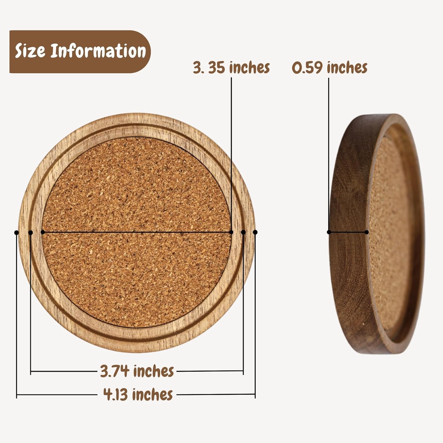 - Wood Cork Coasters With Holder : 6 cup drink coasters, each 4.13 (L) x 4.13 (W) x 0.63 (H), which is big enough to hold most coffee cups, drinking containers and red wine cups. Coaster with holder allows you to tidy the coaster, which will make your home cleaner.