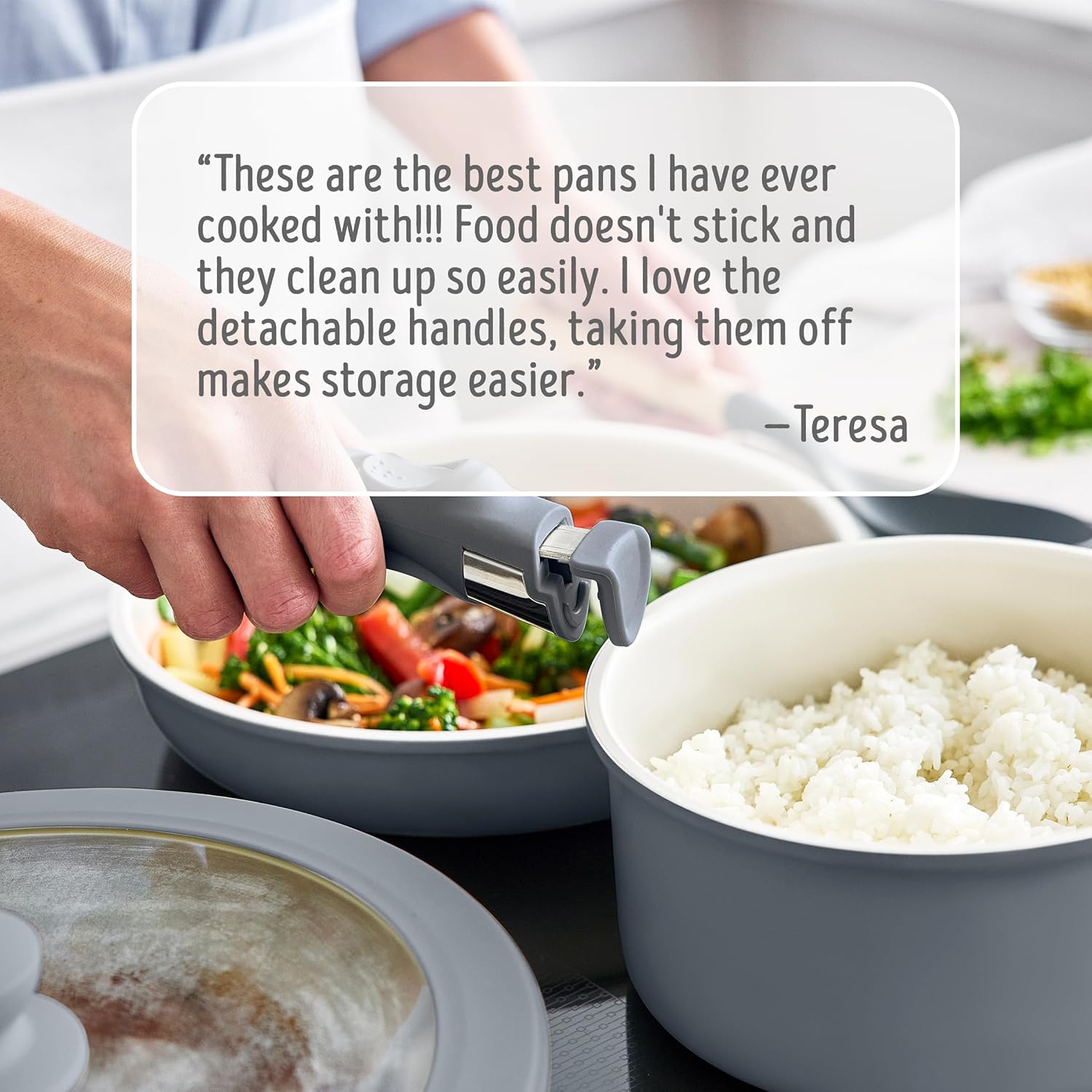 - DETACHABLE HANDLES: Each pan features stay-cool removable handles – just click on to cook and transfer then click off to serve and store.