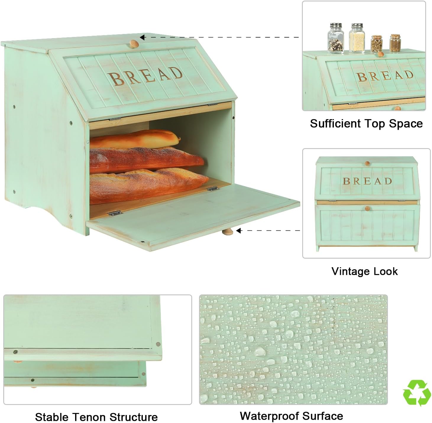 HOMEKOKO Double Layer Large Bread Box for Kitchen Counter, Retro Design Wooden Large Capacity Bread Storage Bin (Mint Green)