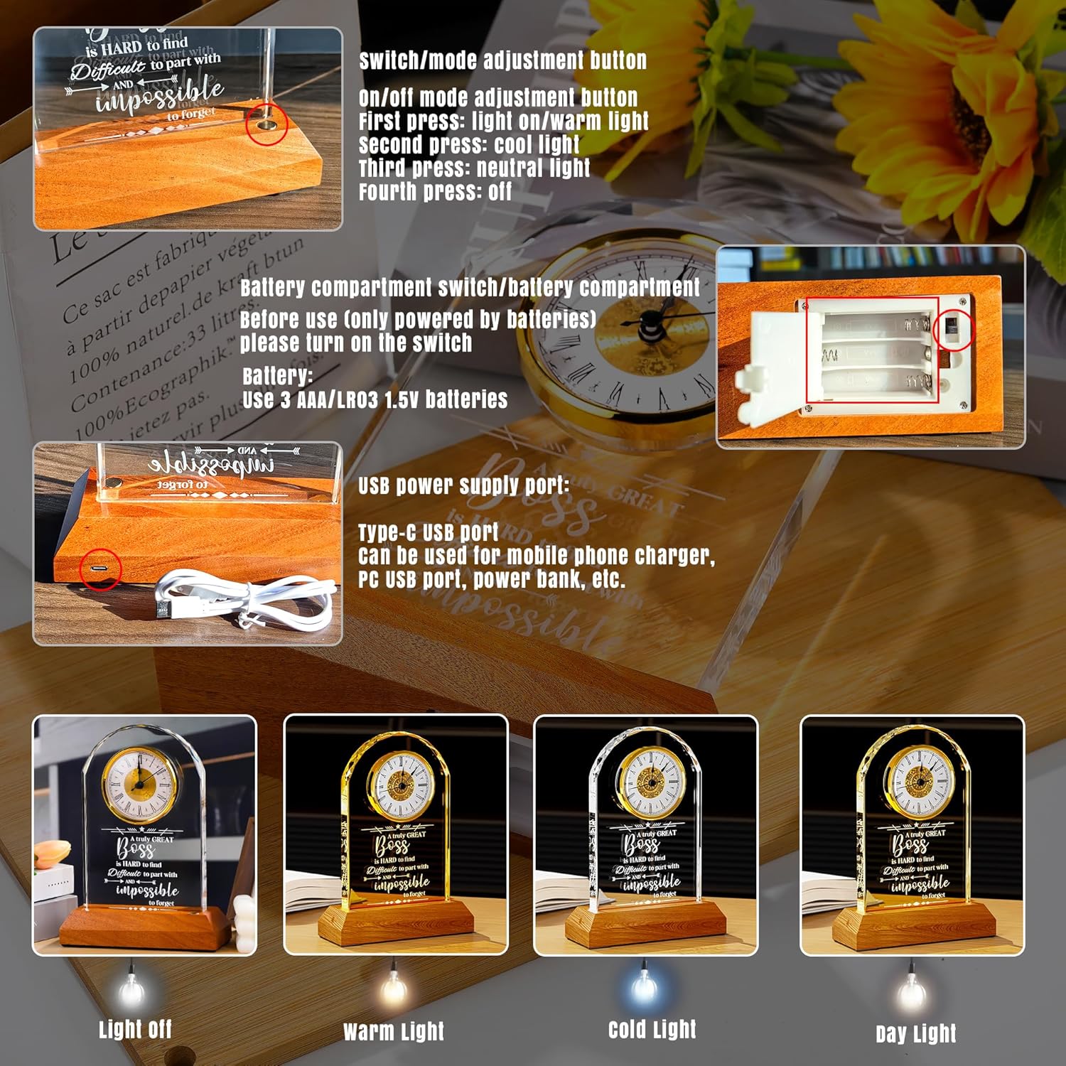 - Elegant Home Decor: This light-up quartz clock is designed with elegance in mind, featuring a crystal-clear clock face and a sturdy wooden base equipped with LED lights. The gentle illumination adds a warm ambiance to any space, making it an ideal boss gift that combines functionality and style