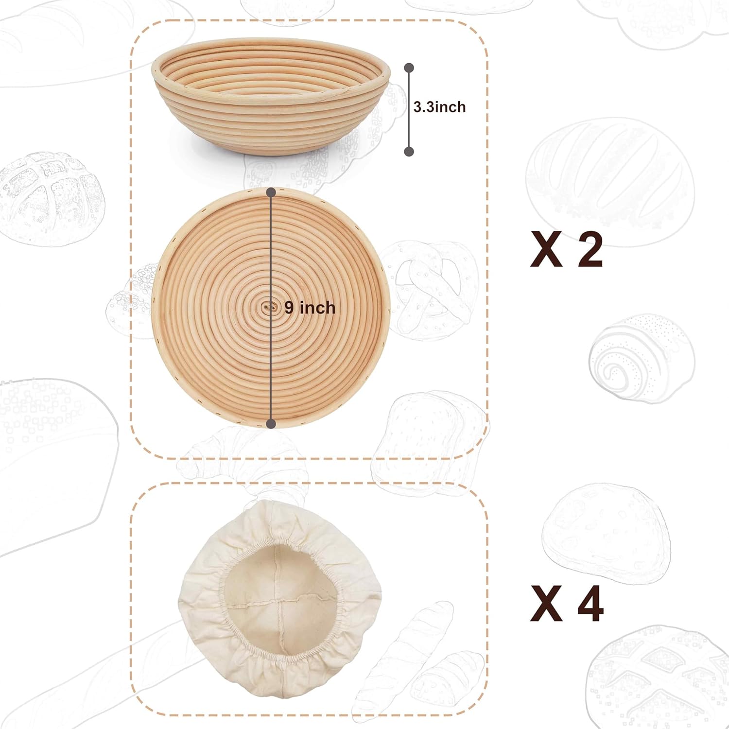- Package Includes: 2 sets of natural rattan proofing baskets, each measuring 9" (D) x 3.3" (H),and 4 washable cloth liners,equivalent to each bread basket being equipped with two cloth liners.