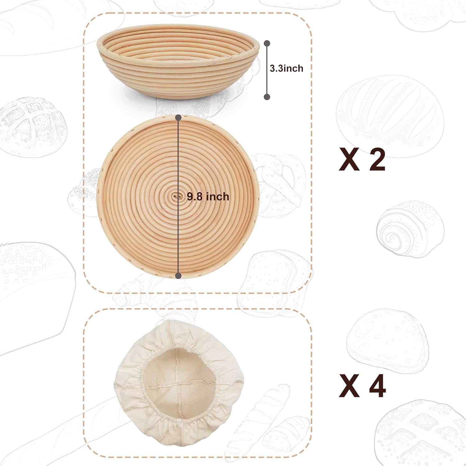- Package Includes: 2 sets of natural rattan proofing baskets, each measuring 9.8" (D) x 3.3" (H),and 4 washable cloth liners,equivalent to each bread basket being equipped with two cloth liners.