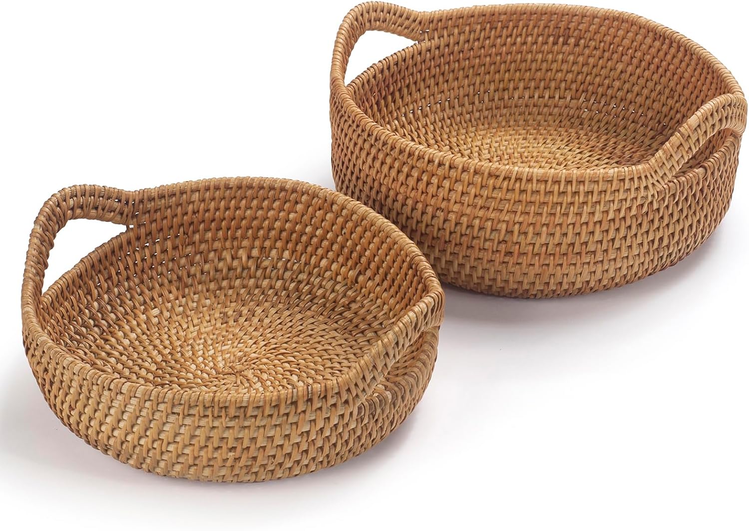 Rattan Storage Basket, Hand Woven Fruit Basket with Handles, Wicker Serving Basket, Bread Basket, Decorative Baskets for Organizing, Set of 2