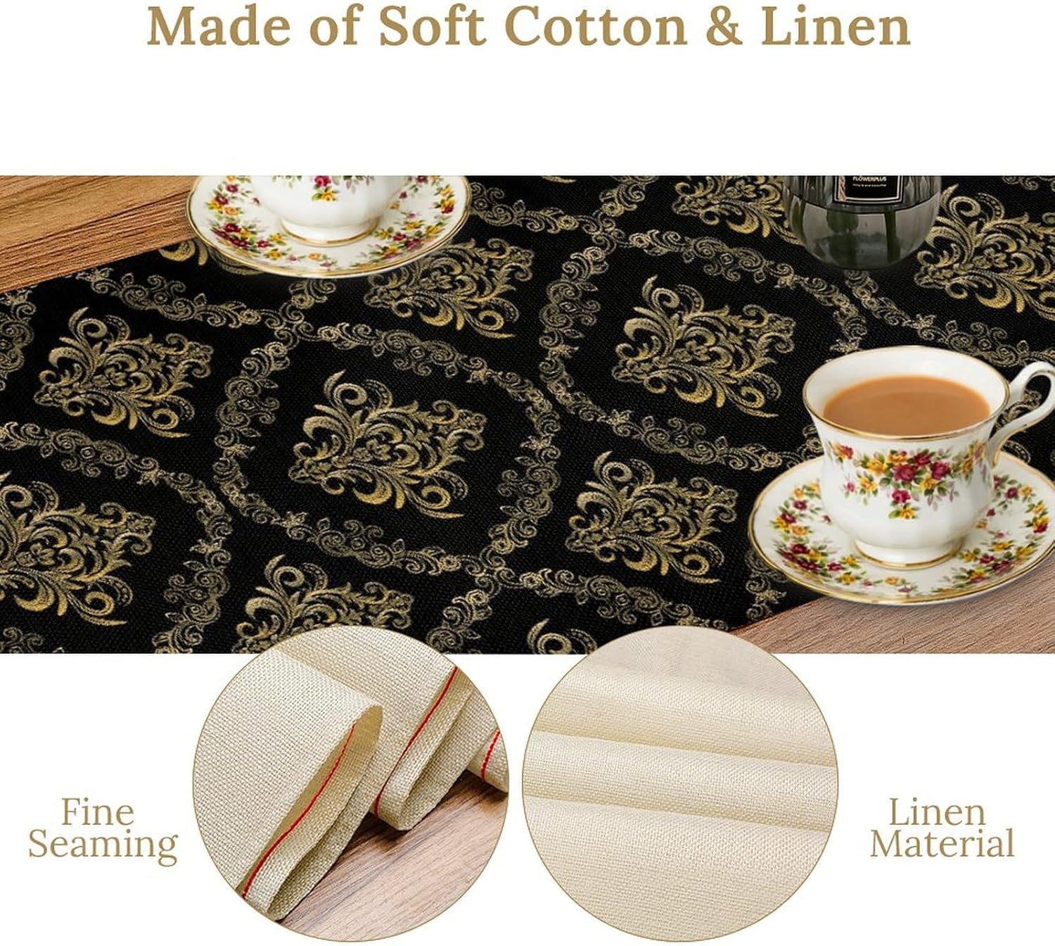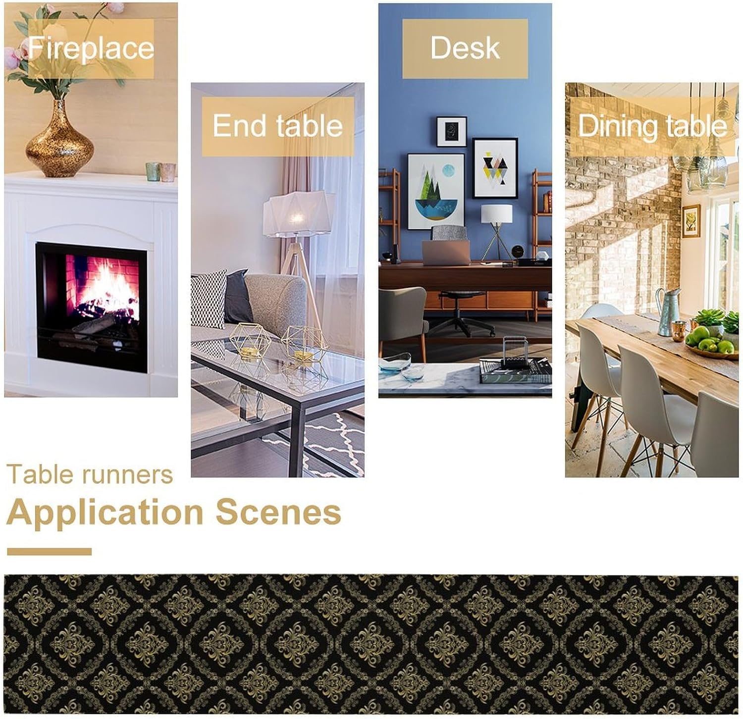Abstract Table Runner, Traditional Ethnic Patterns Golden Floral Black Cool Vintage Table Runner for Kitchen Living Room Party Home 13x60 Inch