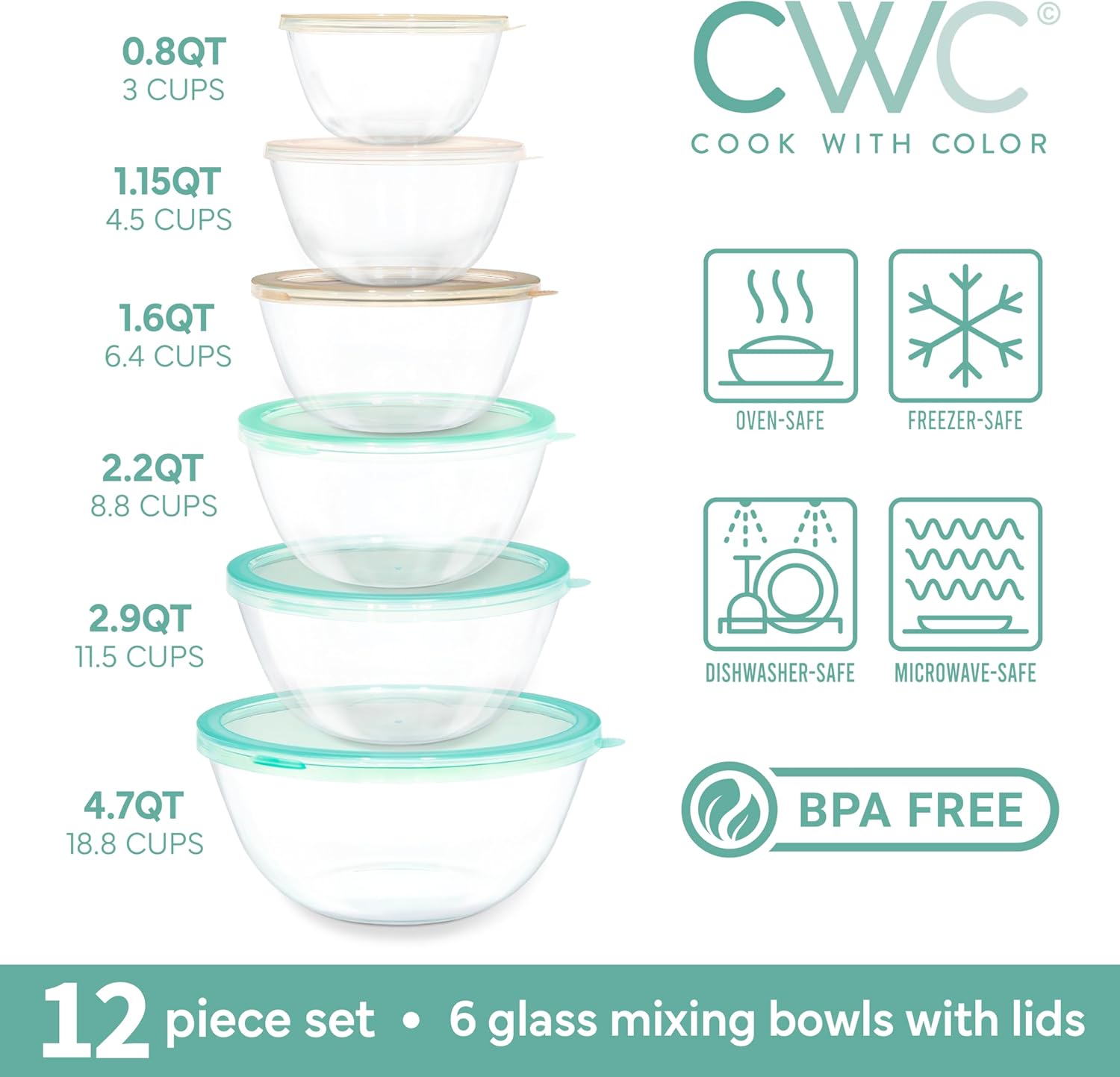 COOK WITH COLOR 12 Pc Glass Mixing Bowl Set with Lids – Borosilicate Glass Nesting Bowls for Cooking, Baking and Meal Prep, Mint