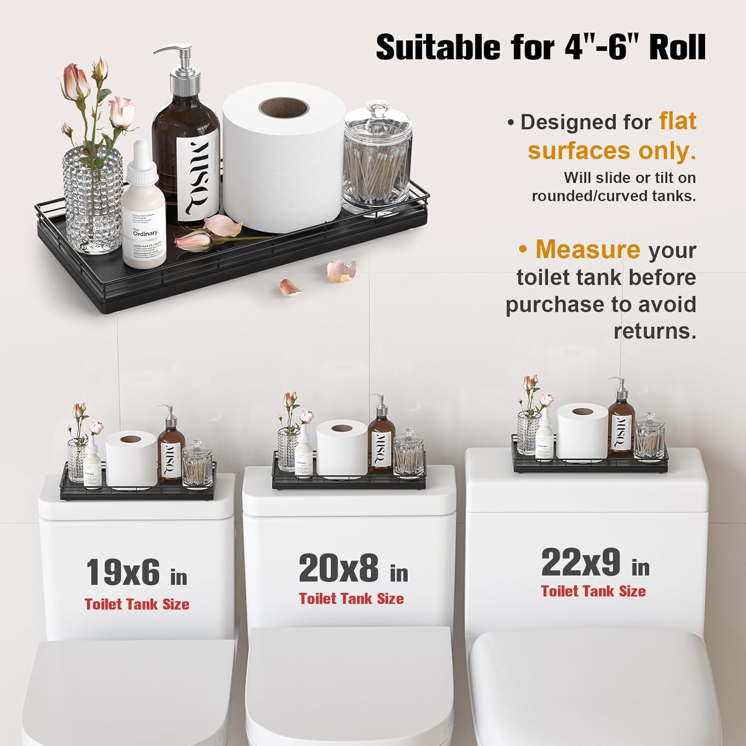 - Versatile Functionality: Elevate your daily routine with our toilet tank basket tray; Neatly arrange bathroom essentials such as toilet paper, lotions, scented candles and potted plants, keeping your countertop tidy; Add a touch of elegance to your dresser by using the bathroom vanity tray to display perfumes, jewelry, and cosmetics; Impress your guests with neatly arranged hand towels and toiletries organized on the large toilet tray for bathroom counter or use it as a kitchen soap tray