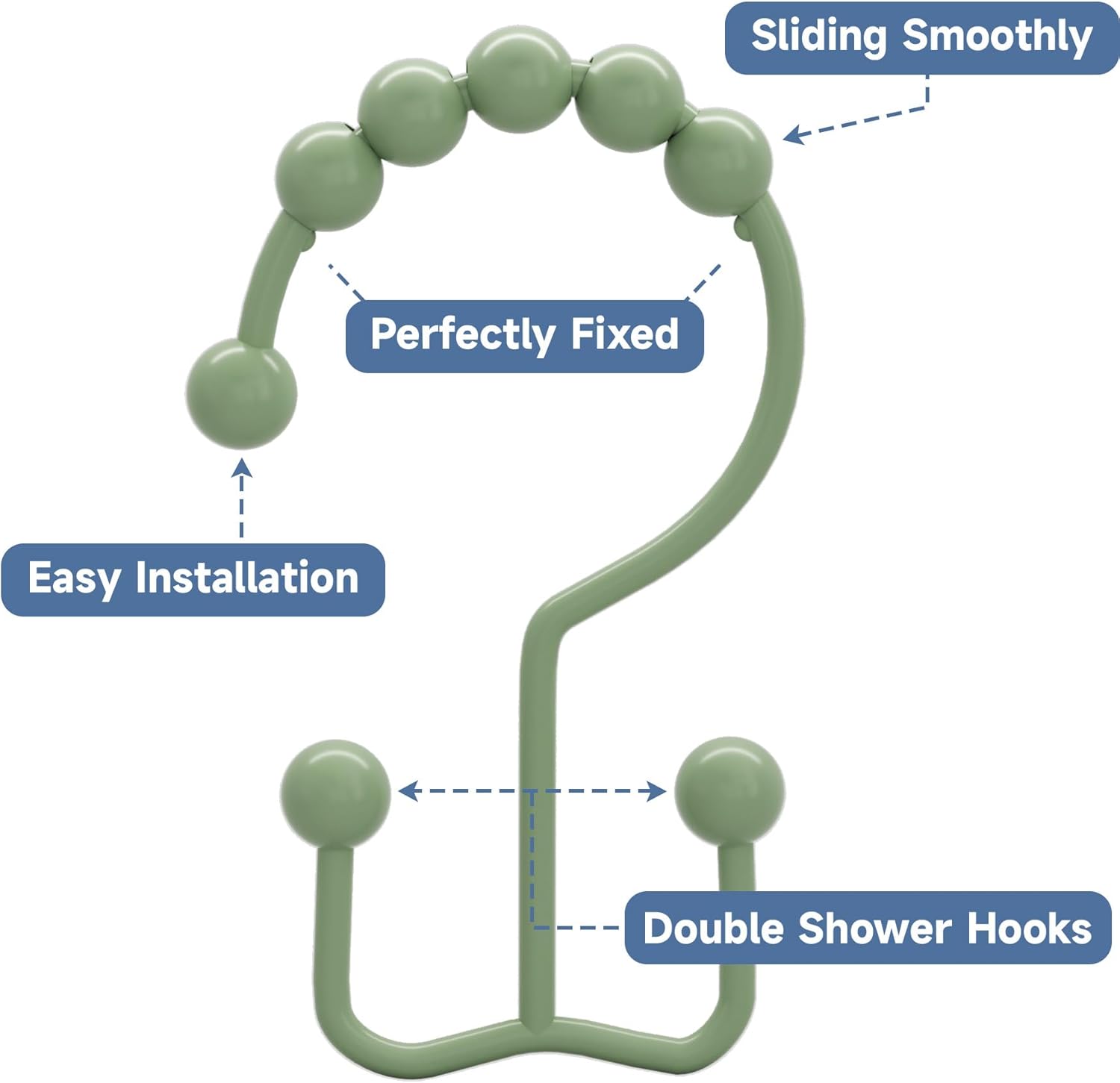- Double hooks design - The double roller glide shower hooks are strong enough to hold up shower curtain and shower liner.