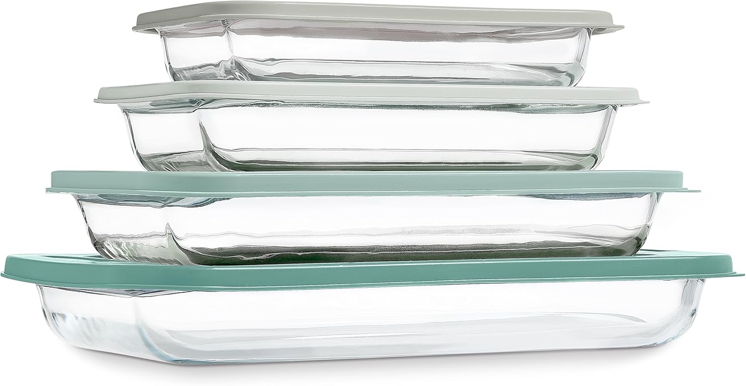 - TIGHT FITTING LIDS: 8-piece baking dishes set includes 4 baking dishes and 4 plastic tight fitting lids, which are designed to keep your food fresher longer. Made with a special non-slip design, you can stack these 4 containers with lids on top of each other in your fridge or freezer for space saving storage. Also they are sloshproof to stop spilling while storing or on the go. The ideal set for baking, serving and storing food