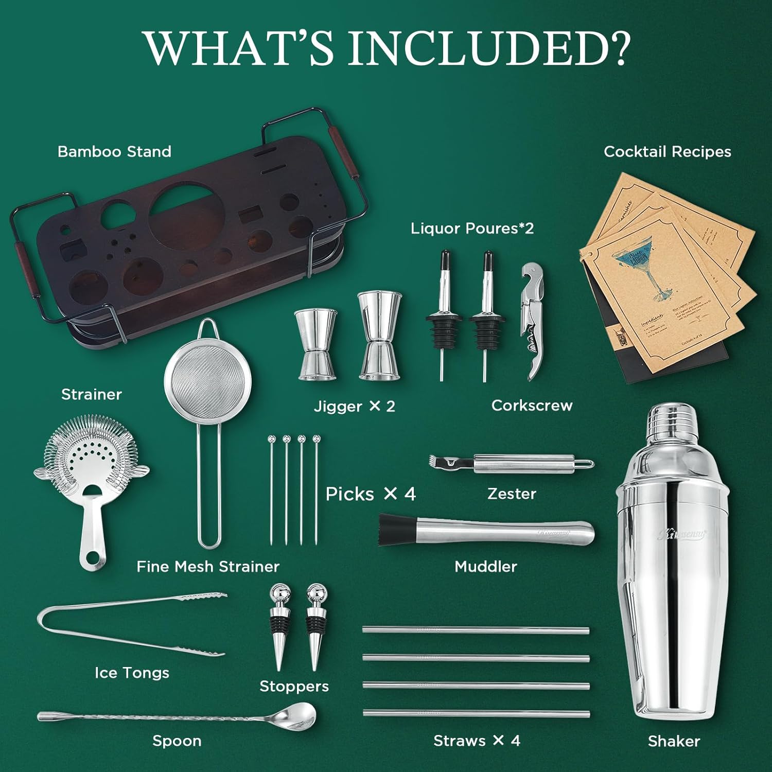 - Everything You Need to Shake Things Up: This all-inclusive 24-piece cocktail set is thoughtfully designed to meet every shakers bartending need. From a 24oz cocktail shaker, strainer, jigger (two capacities), bar spoon, muddler, ice tongs, reusable straws, picks, wine stoppers, bottle pourers, corkscrew, zester, it’s the ultimate bar kit for crafting everything from margaritas to martinis. No drink is off-limits!