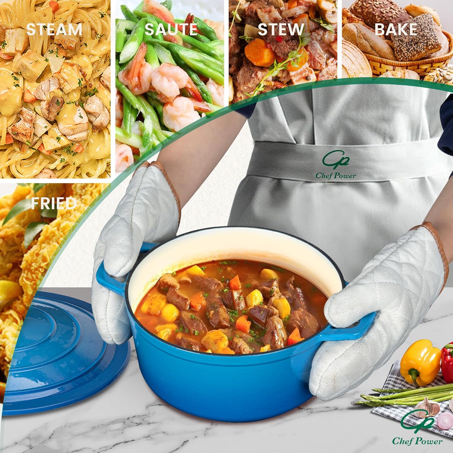 - Functional Cookware – Whether you're stewing, boiling, roasting, or frying, create a variety of delicious dishes all in one enameled dutch oven pot! From kitchen to table, experience endless culinary possibilities with Chef Power.