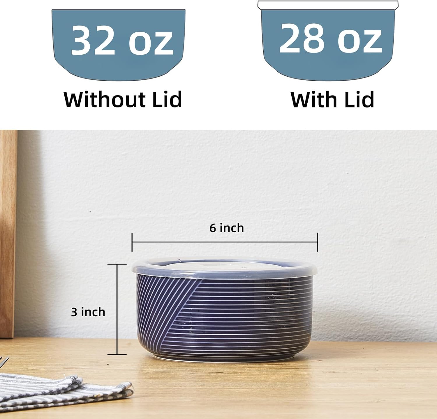 Large Ceramic Bowls with Lids: 32 oz Microwave Safe Food Storage Containers for Soup Salad Meal Prep Lunch Picnic Camping - 6 Inch, Set of 4 (Navy)