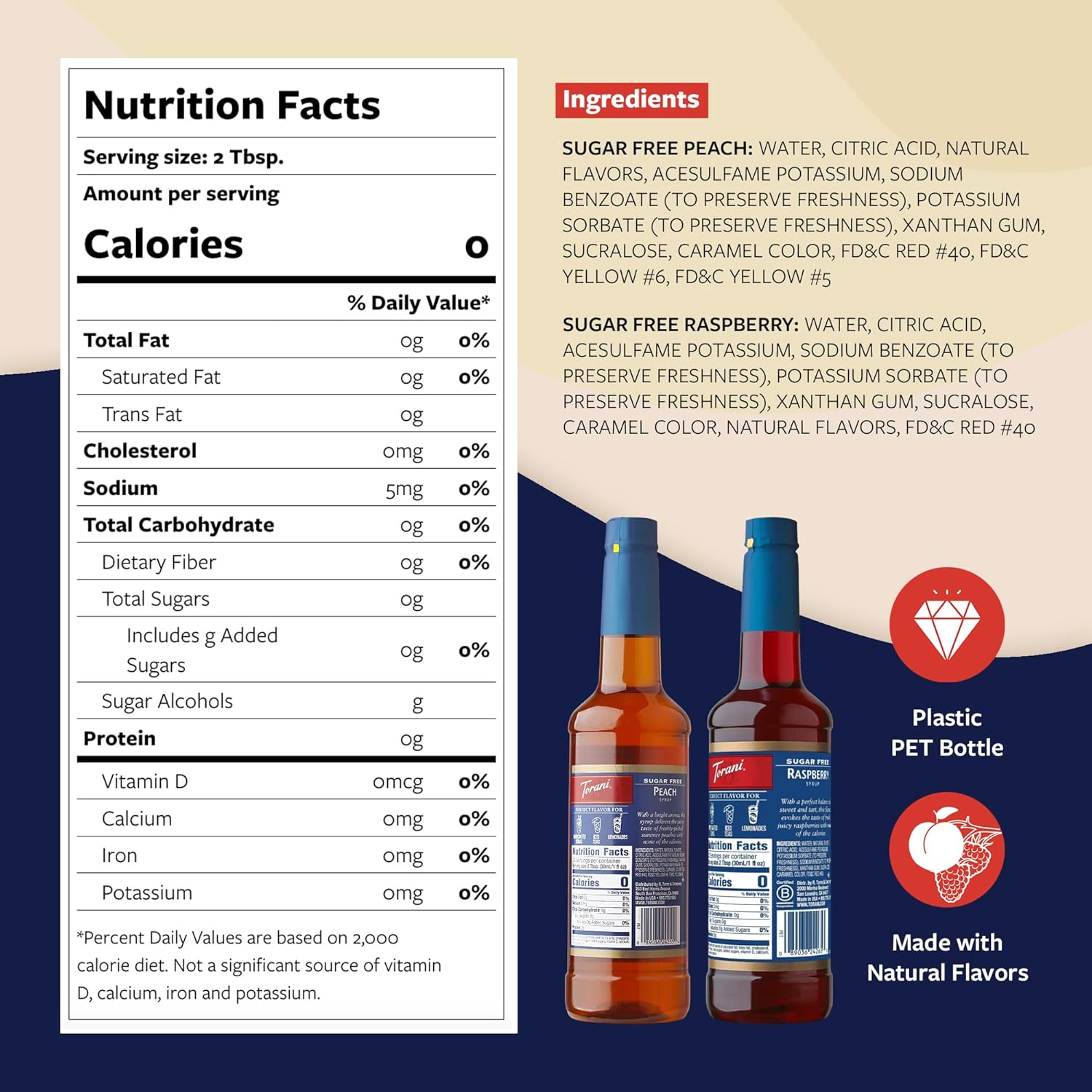 Torani Sugar Free Raspberry Syrup and Sugar Free Peach Syrup Variety 2-Pack, Flavored Syrups for Drinks, Pumps Included, 25.4 Fl Oz Ea