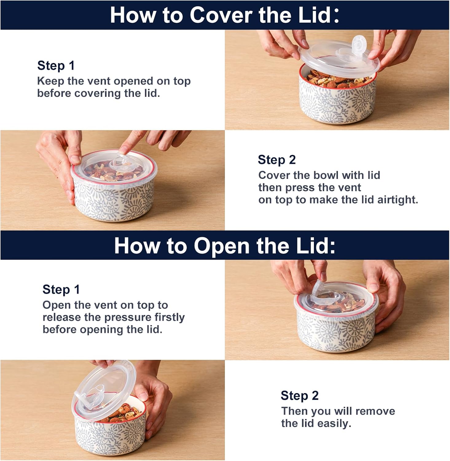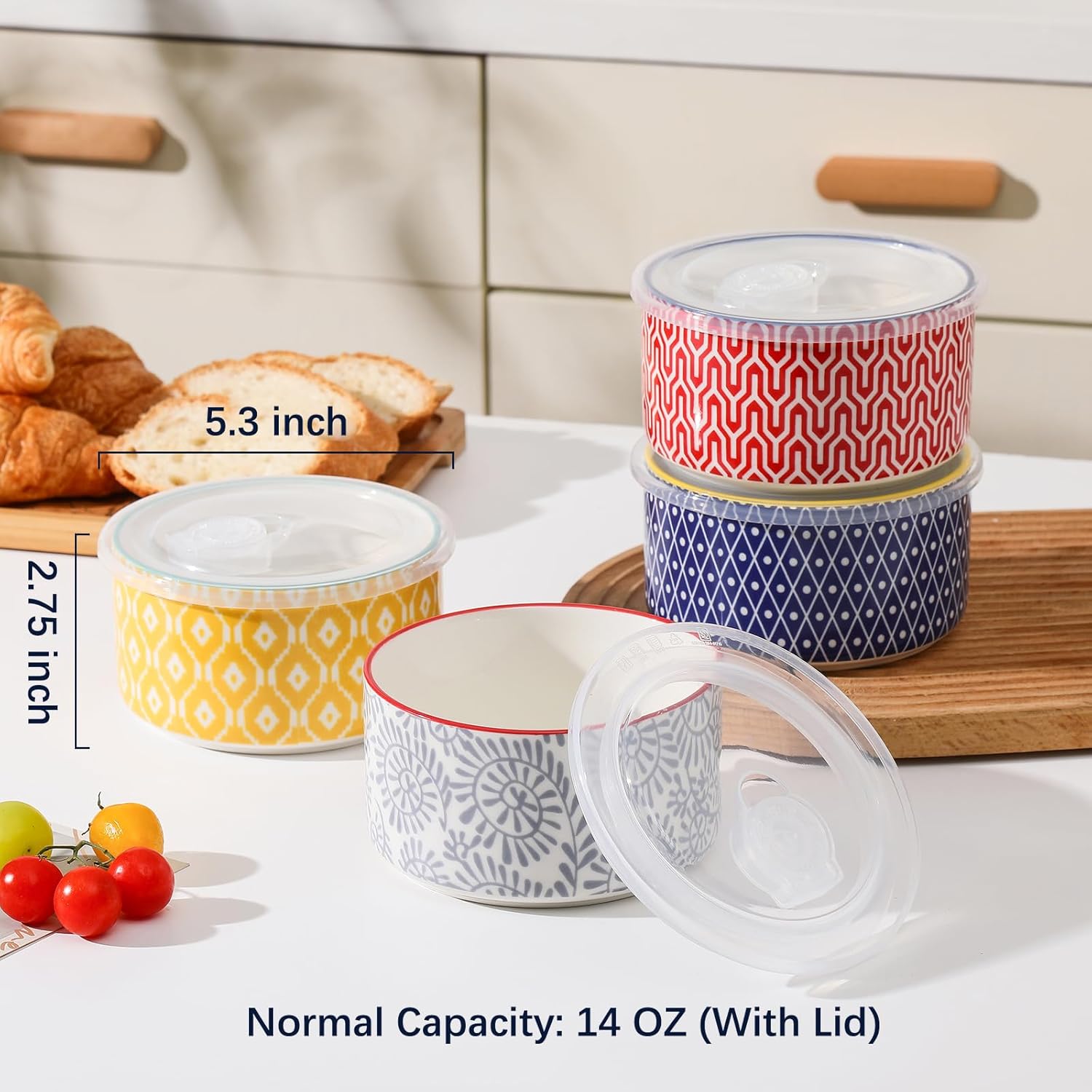 - MULTI-PURPOSE BOWLS WITH LIDS - These ceramic bowls come with airtight lids that ensure your food stay fresh and safe during storage or transport, great for daily use and carrying out that can be used for food storage, meal prep, work lunches, picnics, camping, office meals, etc. Their deep and straight design makes it suitable for a variety of foods such as pasta, salad, cereal, fruit, soup, leftover without spillage.