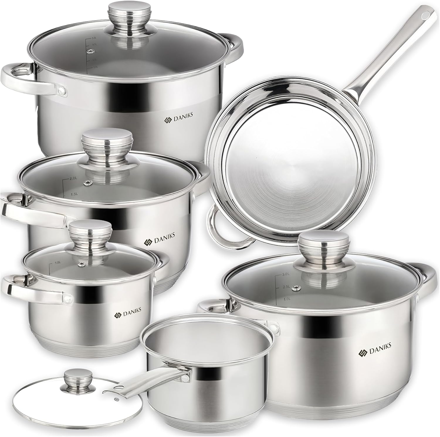 Daniks Standard 11-Piece Stainless Steel Induction Cookware Set, Saucepan, Frying Pan, Dishwasher Safe Pots, Measuring Scale, Glass Lids, For Soup, Pasta, Stew, Silver