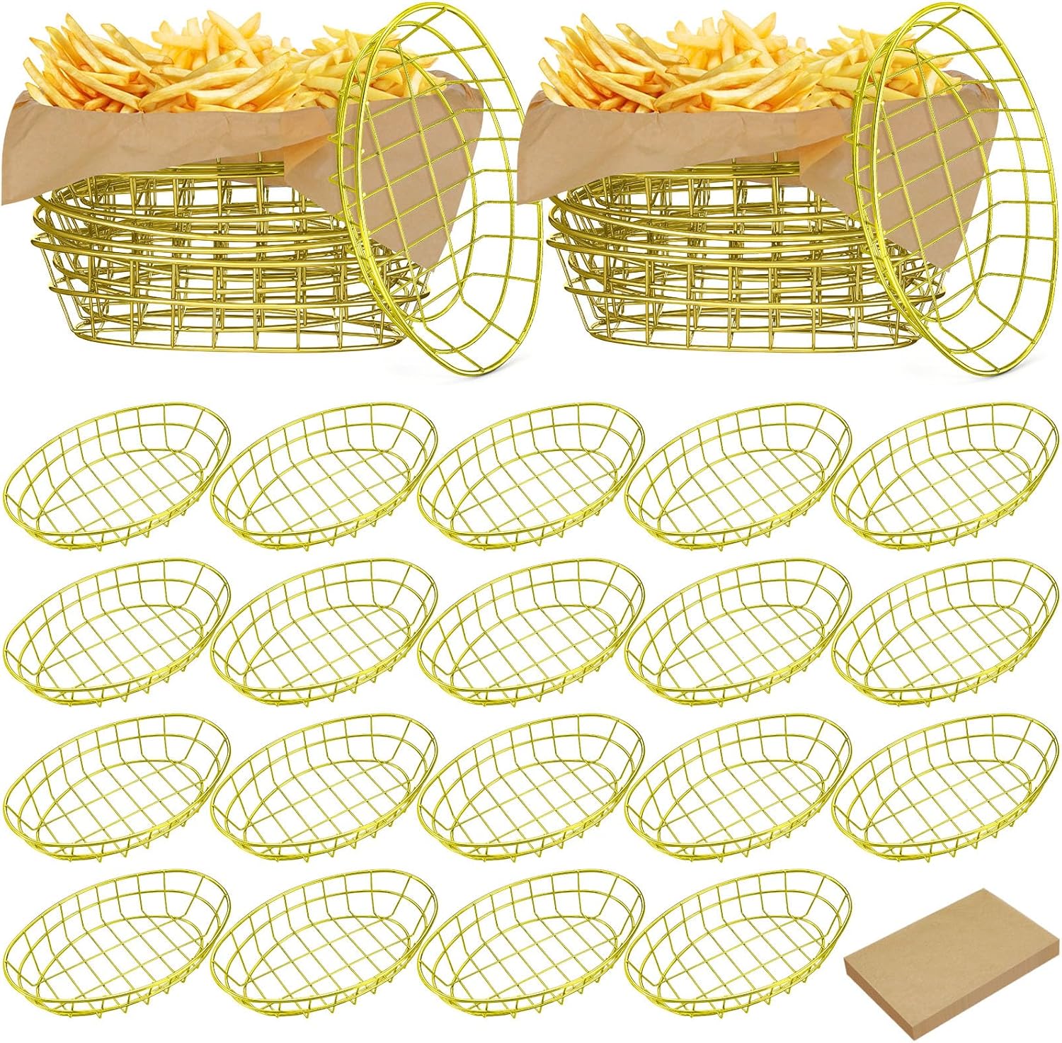 - Sturdy Presented Serving Accessory: you will receive 24 iron bread serving baskets matched with 100 sheets of kraft color wrap paper, which is sturdy yet attractive set that makes your servings get the attention they deserve; Suitable for both indoor and outdoor use, these baskets and wrap papers are also an ideal gift for your friend and families