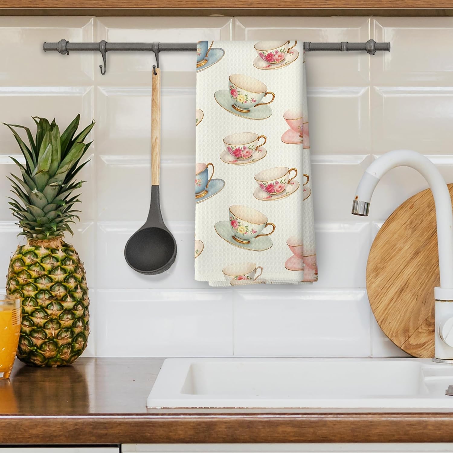 Vintage Spring Floral Teacups Kitchen Dish Towels, Retro French Garden Tea Lover Gifts, Coffee Cup Kitchen Decor, Roses Flower Hand Towels Kitchen Tea Towels Decorations, 16x24inch