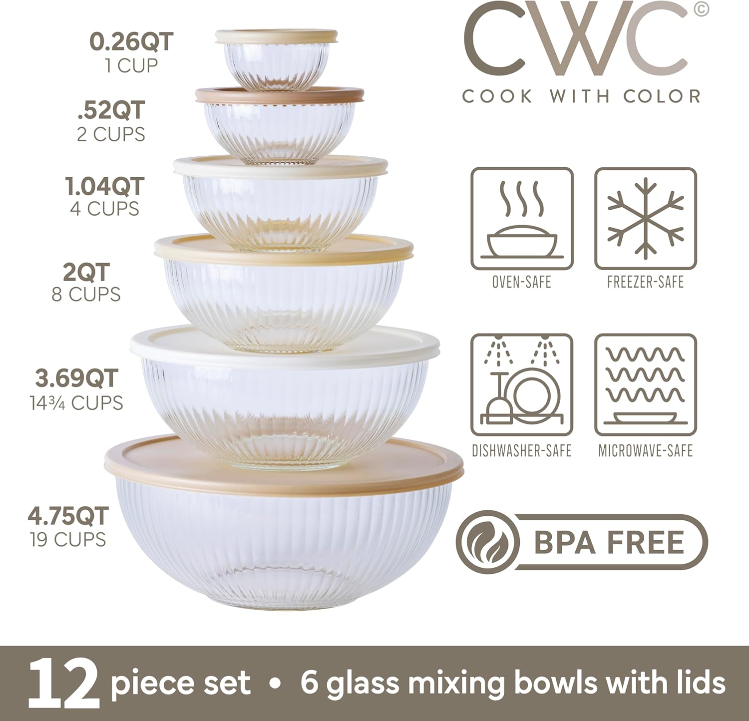 COOK WITH COLOR 12 Pc Glass Mixing Bowl Set with Lids – Borosilicate Glass Nesting Bowls for Cooking, Baking and Meal Prep, Fluted Brown