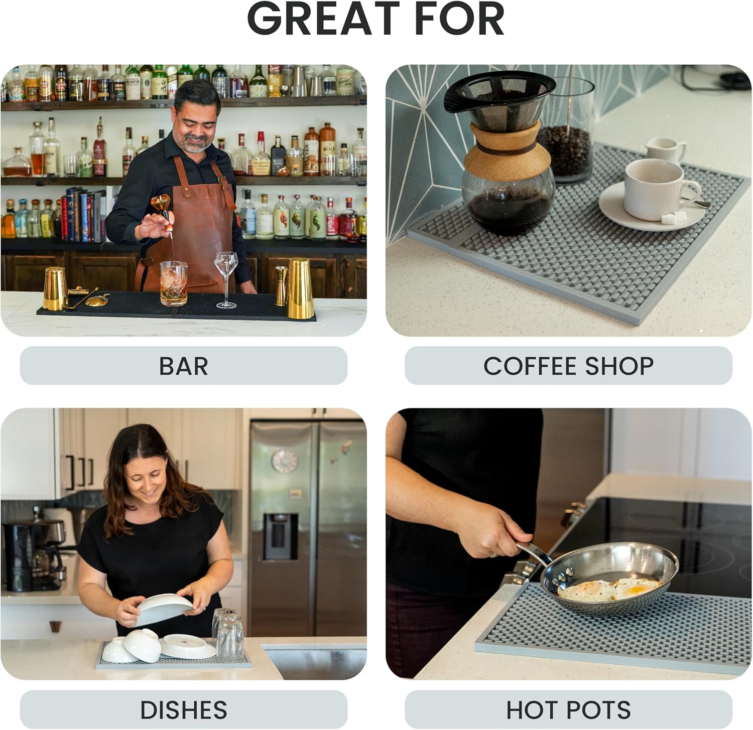 - Goes Everywhere You Need Professional Functionality - Perfect for home bars, coffee stations, restaurant kitchens, man caves, hair salons, or anywhere you demand quality. One customer even uses it under their sink to catch drips (we think that's doing the mat dirty, but you do you!). Works brilliantly as an espresso station mat, cocktail prep surface, or kitchen counter upgrade. Elevates any workspace instantly with professional-grade performance that adapts to your lifestyle and needs.