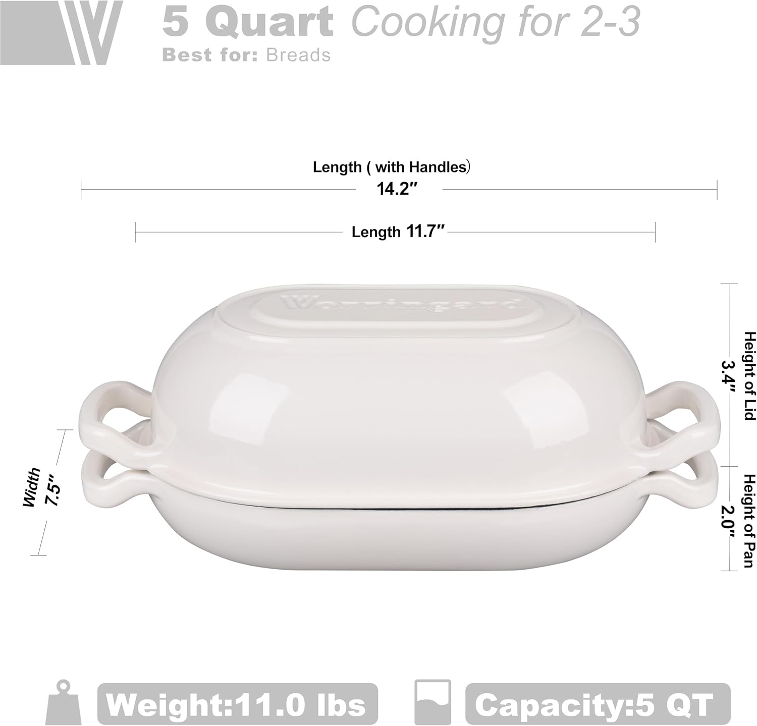 Enameled Cast Iron Sourdough Bread Oven, Dutch Oven, Loaf Cast Iron Bread Pan for Homemade Bread Baking, Meatloaf Pan with Lid, 5QT, White
