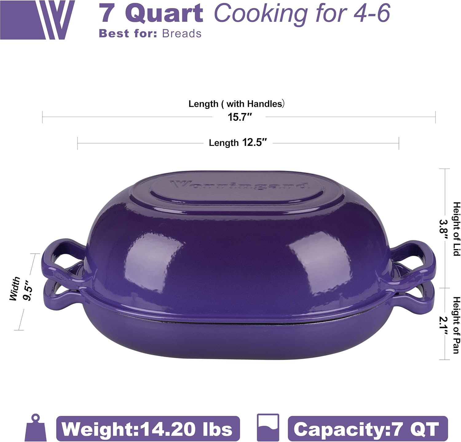 Enameled Cast Iron Sourdough Bread Oven, Dutch Oven, Loaf Cast Iron Bread Pan for Homemade Bread Baking, Meatloaf Pan with Lid, 7QT, Purple