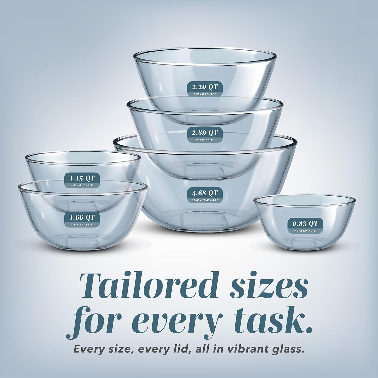 - Complete 12-Piece Set: Includes 6 colored glass mixing bowls with 6 airtight lids – perfect for food storage, meal prep, and serving all in one. The set includes bowls with capacities of 26.72 oz, 36.85 oz, 53.25 oz, 70.67 oz, 92.66 oz, and 149.85 oz, all made from high borosilicate clear glass with colored lids.