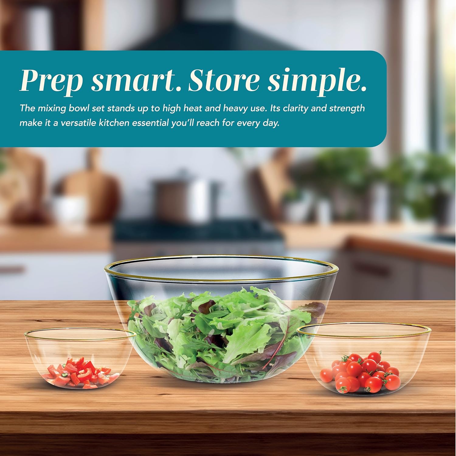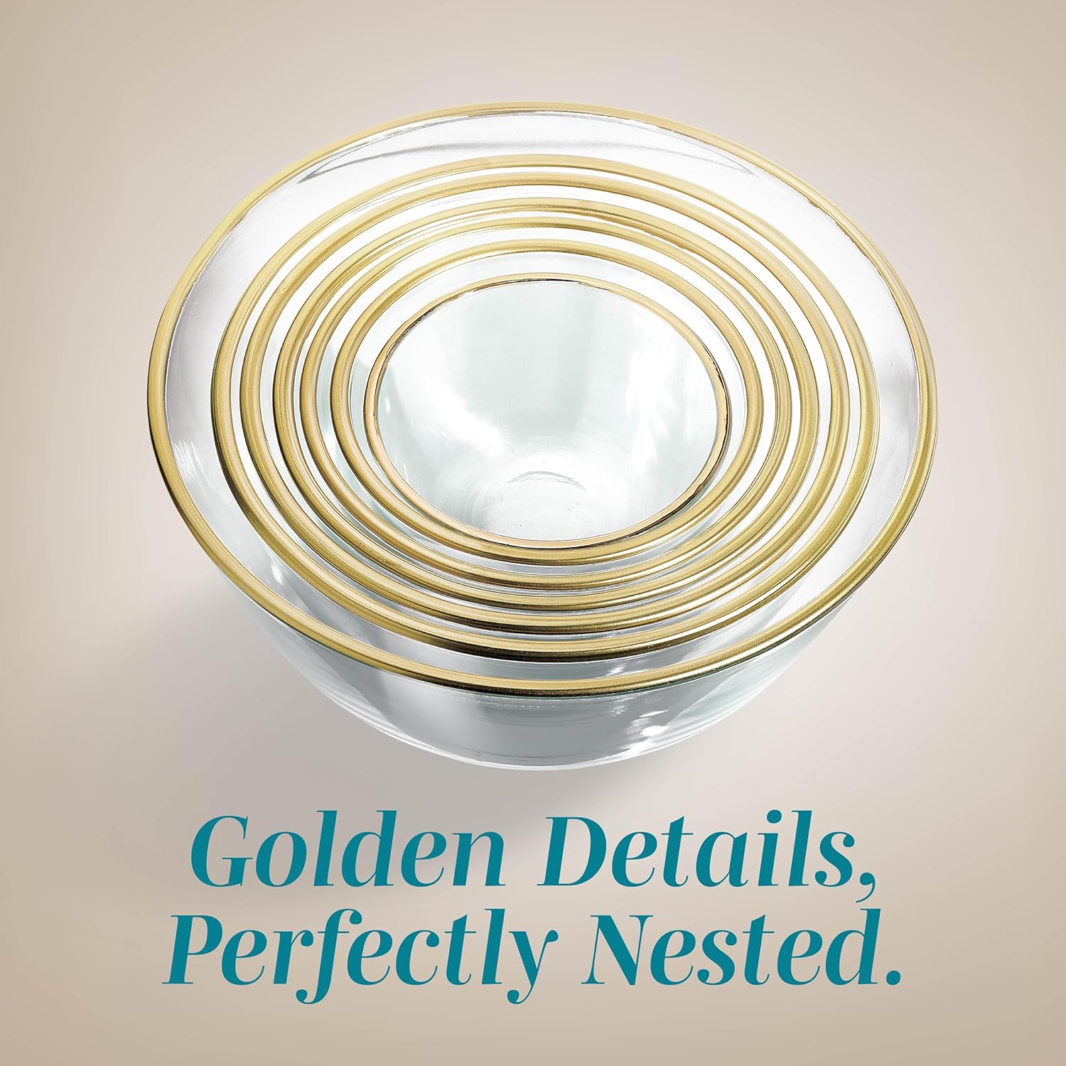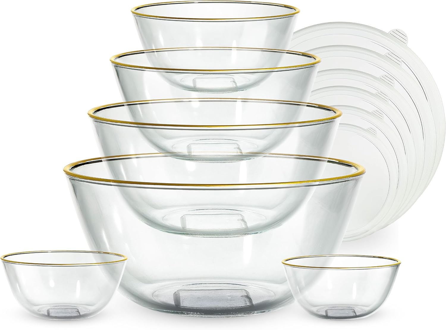 - Complete 12-Piece Set: Includes 6 glass mixing bowls with a gold rim and 6 airtight lids – perfect for food storage, meal prep, and serving all in one. The set includes bowls with capacities of 26.72 oz, 36.85 oz, 53.25 oz, 70.67 oz, 92.66 oz, and 149.85 oz, all made from high borosilicate clear glass with colored lids.