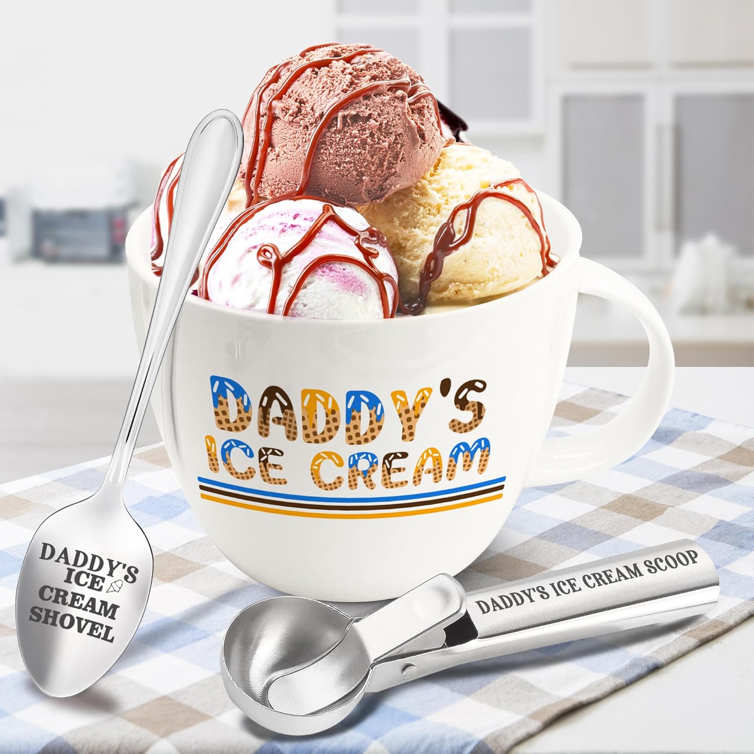 - Perfect Daddy Gift Idea - Exclusive Christmas gifts for dad, the ice cream bowl is designed with waffle cone and colorful ice cream, printed with the words "Daddy's Ice Cream", it is an exclusive ice cream bowl for dad, also the ice cream scoop and spoon are printed with the words "Daddy's Ice Cream". An exclusive and unique gift for dad to enjoy pleasure while eating ice cream and also an exclusive happy time with kids.