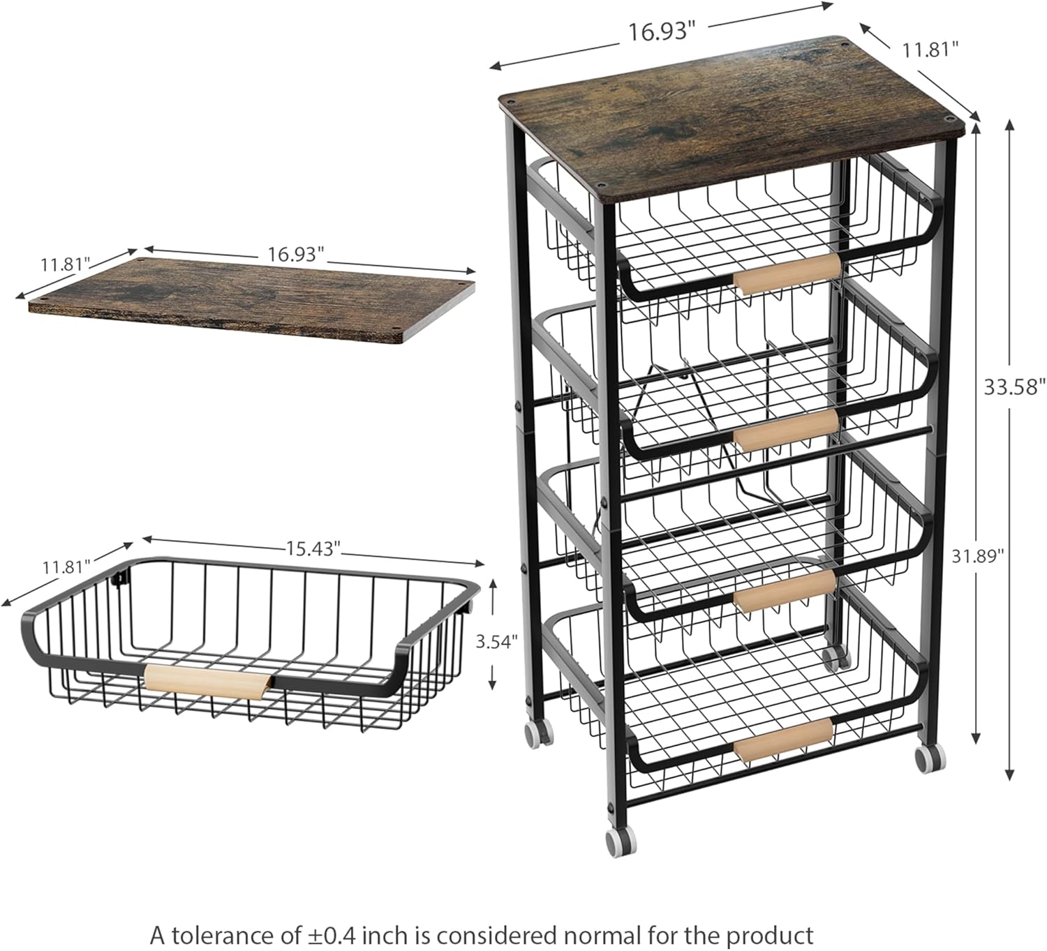 - 【Space-Saving Fruit Kitchen Basket】This dimension of Morden Fruit organizer is 11.81" LX 16.93" WX 33.58" H, very suitable for small place. The kitchen cart with wheels can make your place more tidy and comfortable