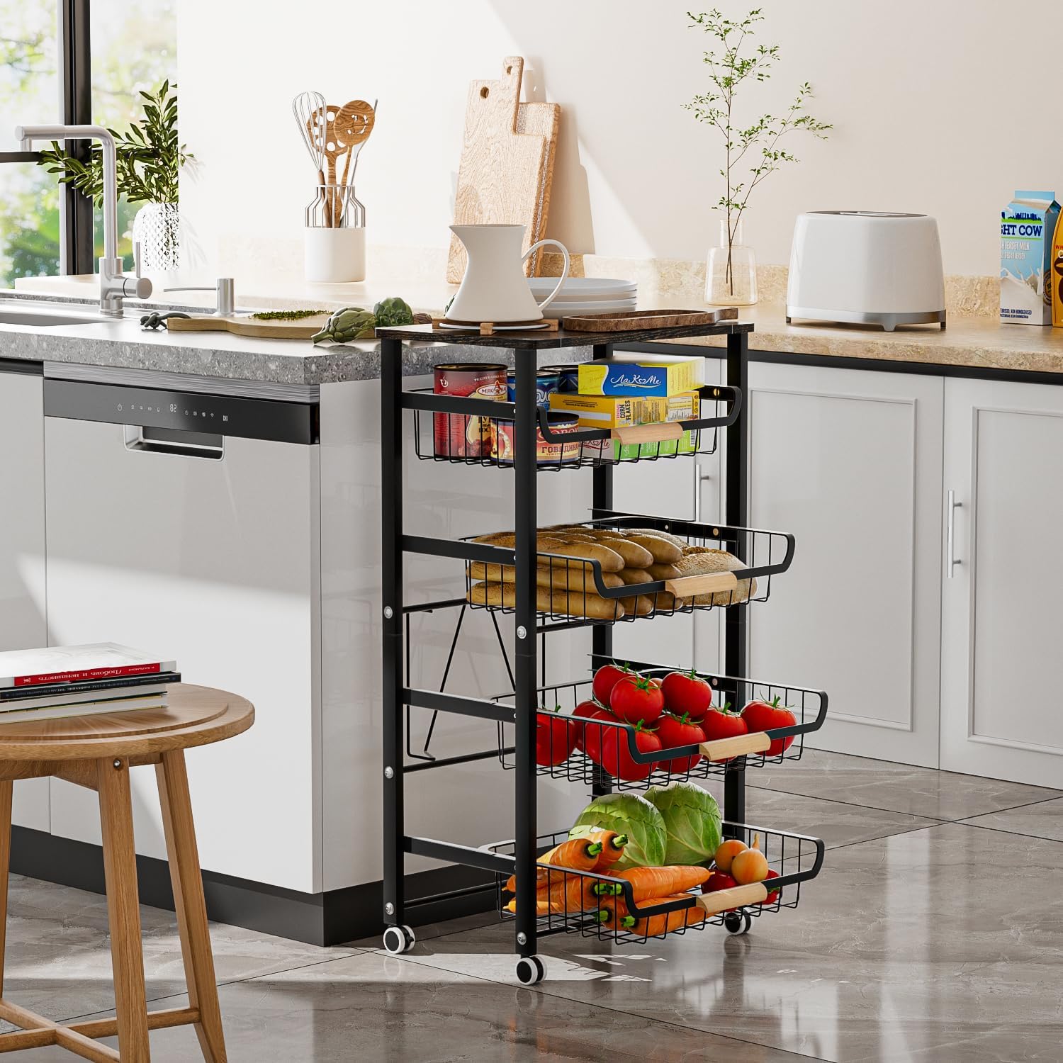 JAQ Fruit Basket for Kitchen, 5-Tier Slide Out Storage Baskets Carts Organizers Drawers with Wood Top Table with Rolling Wheels for Snacks Vegetables Vianderos para Cocina Modernos (Black, 5 Layer)