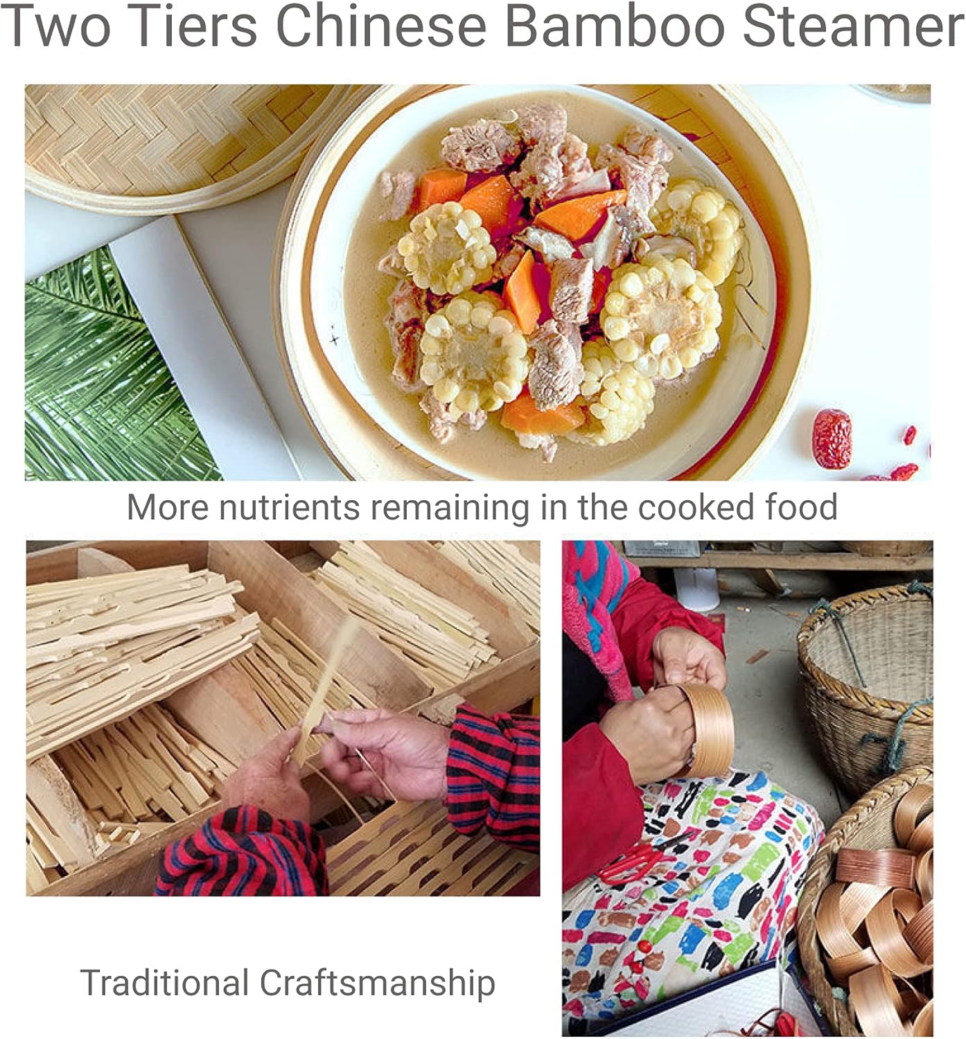 - Traditional Handcrafted Design: Our handmade Traditional Chinese Bamboo Steamer includes one lid and two stackable baskets, allowing you to cook multiple dishes simultaneously. Perfect for steaming dim sum, dumplings, buns, seafood, and vegetables, this steamer preserves the authenticity of Chinese cuisine while making meal prep efficient and flavorful. Add a touch of traditional craftsmanship to your kitchen with this versatile bamboo steamer.
