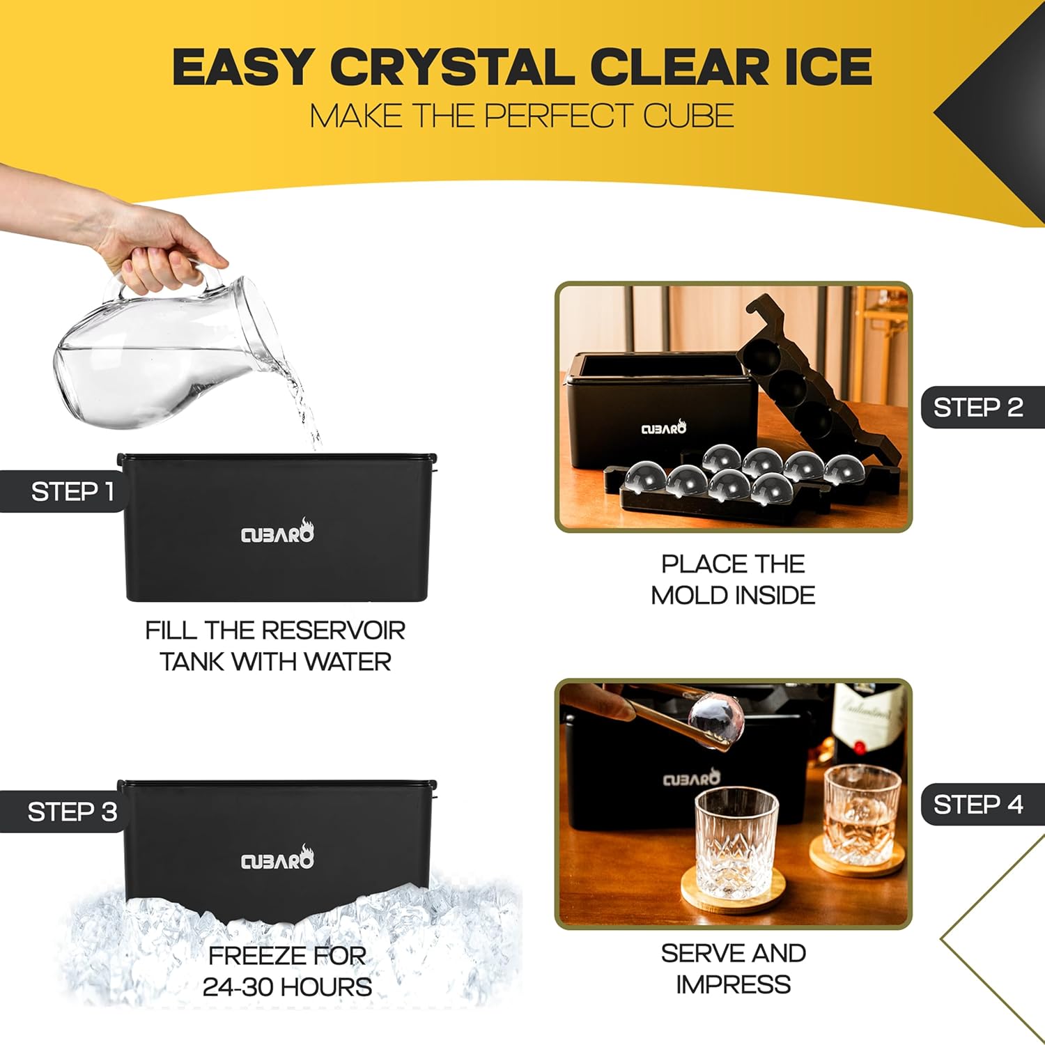 - EASY 4-STEP CLEAR ICE MAKER – Simply fill the reservoir, place the sphere ice mold, freeze 24–30 hours & release eight clear spheres. The simple, mess-free routine makes this an ideal ice mold for cocktails, home bars, beginners and craft ice lovers.